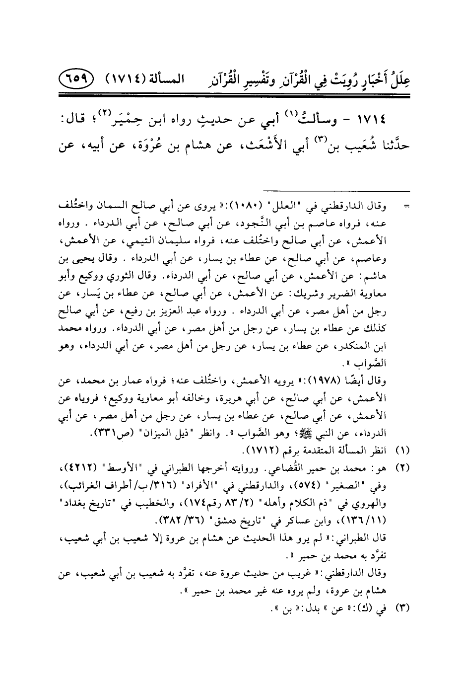 ١٧١٤ - وسألتُ (١) أَبِي عَنْ حديثٍ رَوَاهُ ابْنُ حِمْيَر (٢) ؛ قَالَ: حدَّثنا شُعَيب بْنُ (٣) أَبِي الأَشْعَث، عَنْ هِشَامِ بْنِ عُرْوَة، عَنْ أَبِيهِ، عَنْ