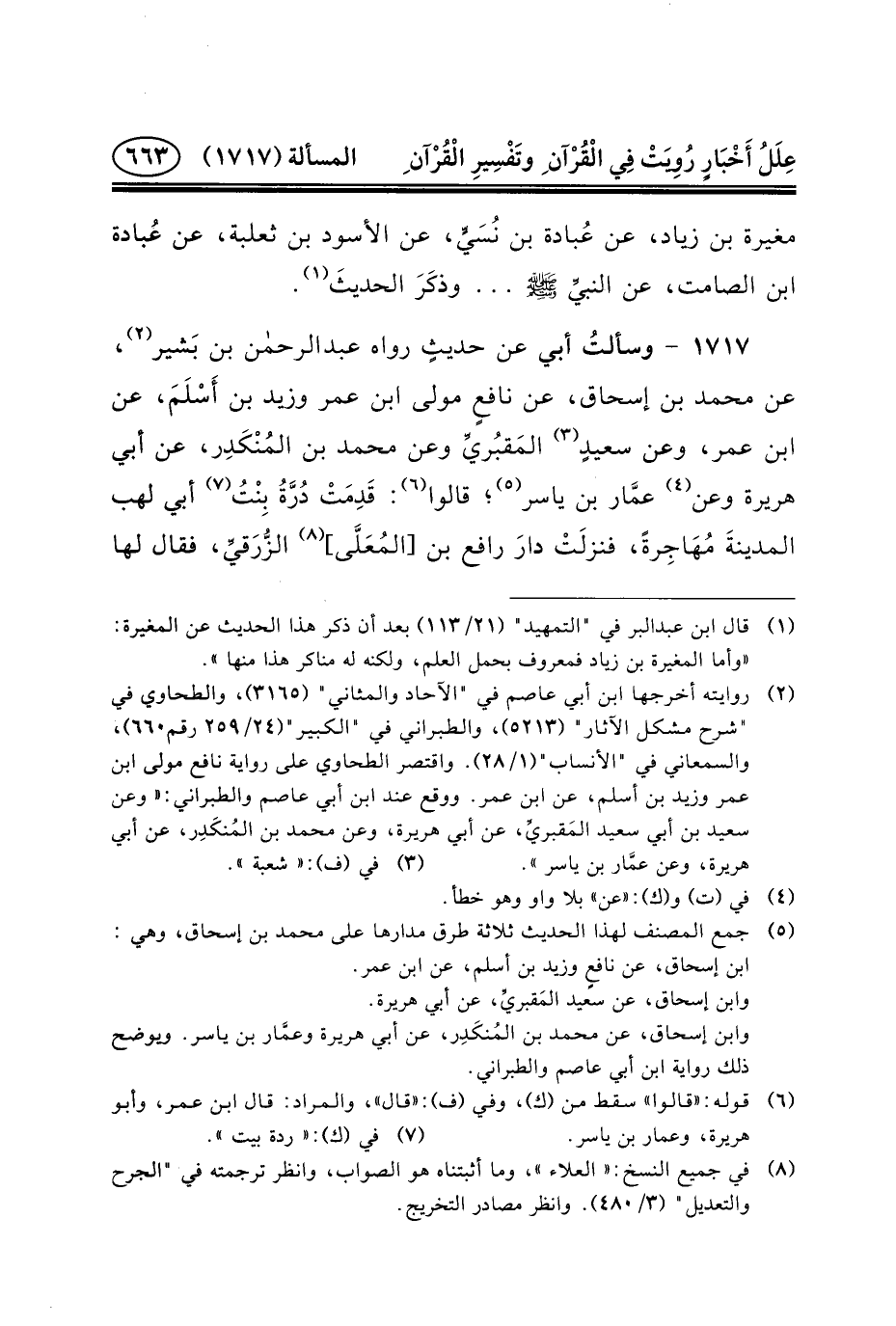 ١٧١٧ - وسألتُ أَبِي عَنْ حديثٍ رواه عبد الرحمن بْنُ بَشير (٢) ، عَنْ مُحَمَّدِ بْنِ إِسْحَاقَ، عَنْ نافعٍ مَوْلَى ابْنِ عُمَرَ وَزَيْدُ بْنُ أَسْلَمَ، عَنِ ابْنِ عُمَرَ، وَعَنْ سعيدٍ (٣) المَقبُريِّ وَعَنْ مُحَمَّدِ بْنِ المُنْكَدِر، عَنْ أبي هريرة وعن (٤) عمَّار بْنِ يَاسِرٍ (٥) ؛
