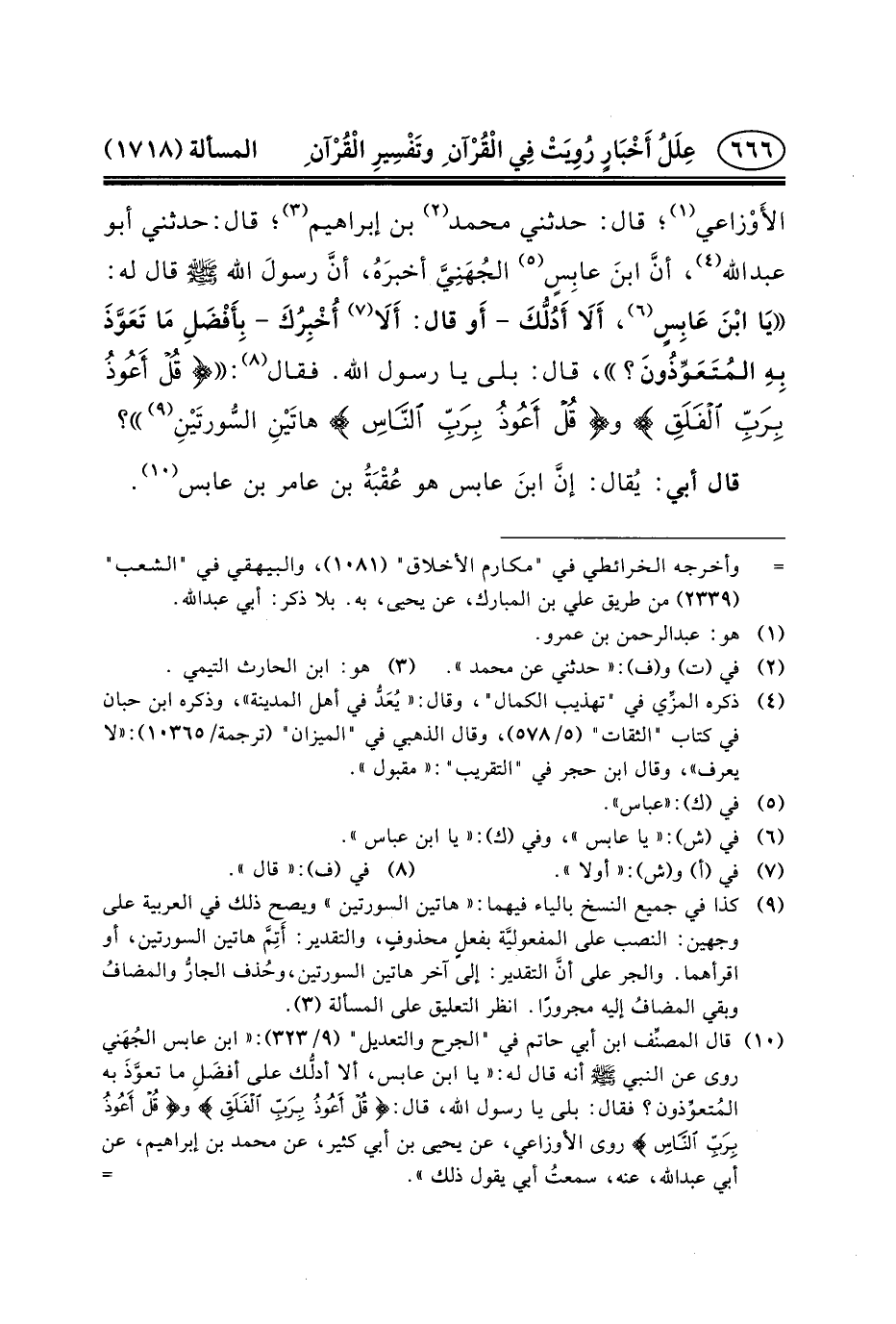 الأَوْزاعي (١) ؛ قَالَ: حَدَّثَنِي مُحَمَّدُ (٢) بْنُ إبراهيم (٣) ؛ قال: حدثني أبو عبد الله (٤) ، أنَّ ابنَ عابِسٍ (٥) الجُهَنِيَّ أخبرَهُ، أنَّ رسولَ الله (ص) قَالَ لَهُ: يَا ابْنَ عَابِسٍ (٦) ، أَلَا أَدُلُّكَ - أَو قَالَ: أَلَا (٧) أُخْبِرُكَ - بِأَفْضَلِ مَا تَعَوَّذَ بِهِ المُتَعَوِّذُونَ؟ ، قَالَ: بَلَى يَا رَسُولَ الله. فقال (٨) : {أَعُوذُ بِرَبِّ الْفَلَقِ} وَ {قُلْ أَعُوذُ بِرَبِّ النَّاسِ *} هاتَيْنِ السُّورتَيْنِ (٩) ؟