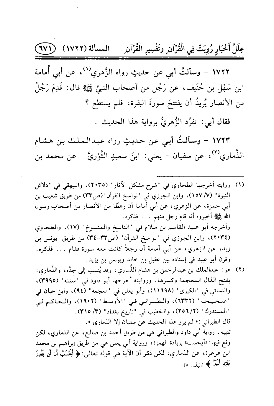 ١٧٢٢ - وسألتُ أَبِي عَنْ حديثٍ رَوَاهُ الزُّهري (١) ، عَنْ أَبِي أُمامة بْن سَهْل بْنِ حُنَيف، عَنْ رَجُل من أصحاب النبيِّ (ص) قَالَ: قَدِمَ رَجُلٌ مِنَ الأَنْصَارِ يُريدُ أَنْ يفتتحَ سورةَ الْبَقْرَةِ، فَلَمْ يَسْتَطِعْ؟