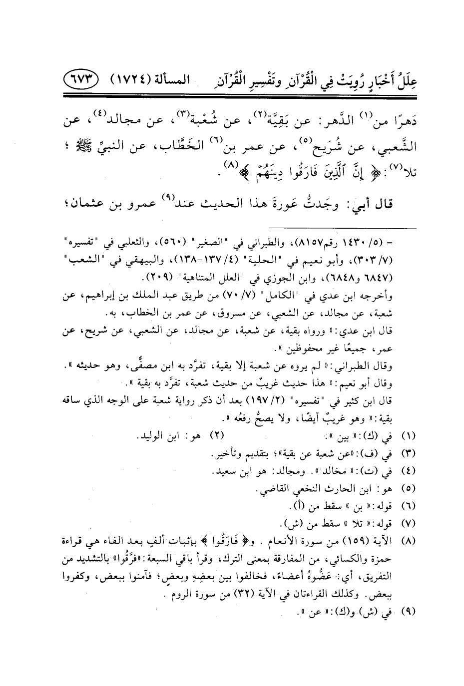 دَهرًا مِنَ (١) الدَّهر: عَنْ بَقِيَّة (٢) ، عَنْ شُعْبة (٣) ، عَنْ مُجَالِدٍ (٤) ، عَنِ الشَّعبي، عَنْ شُرَيح (٥) ، عَنْ عُمَرَ بن (٦) الخَطَّاب، عن النبيِّ (ص) ؛ تلا (٧) : ُ،) فَارَقُوا ت ِ (٨) .