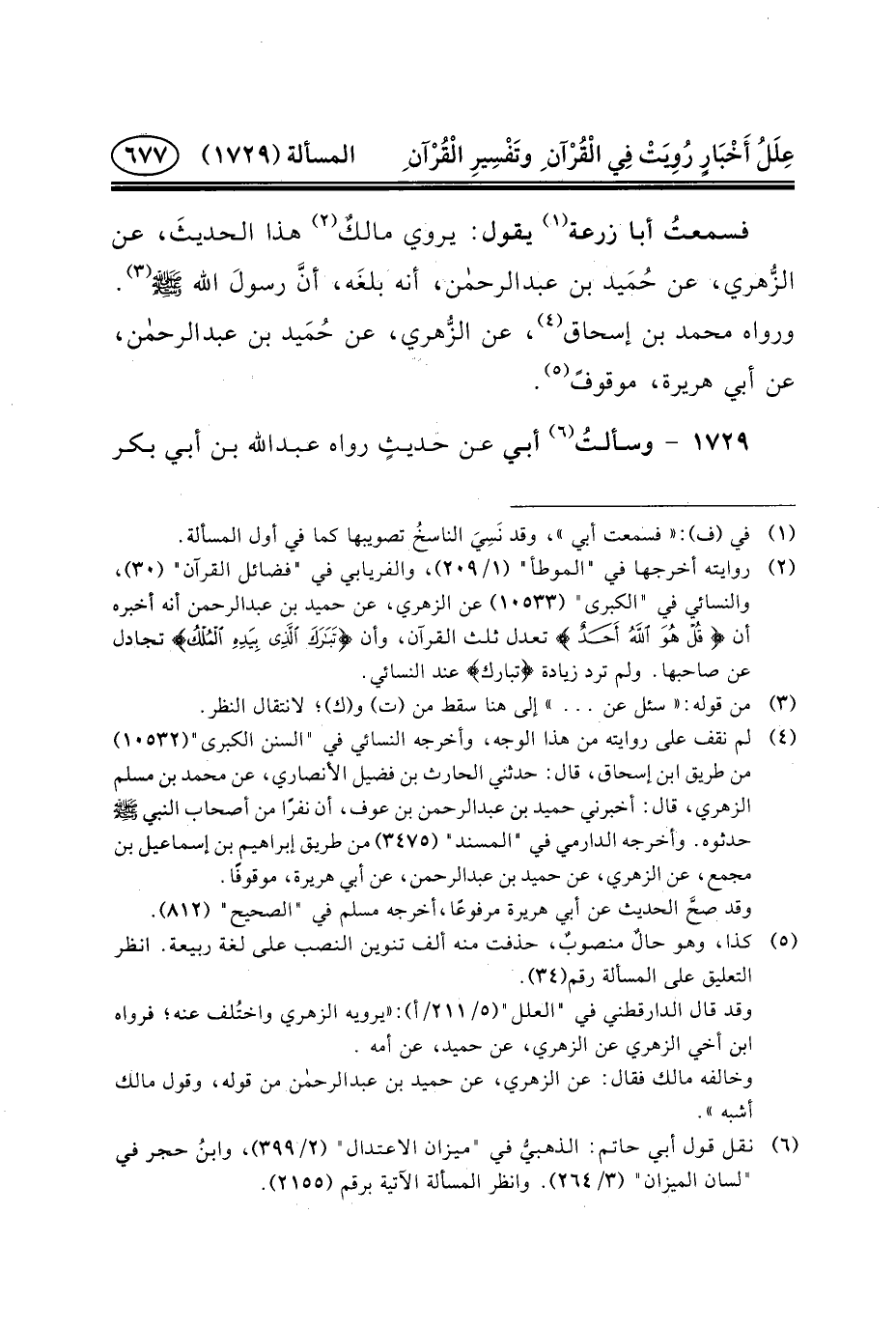 فسمعتُ أَبَا زُرْعَةَ (١) يَقُولُ: يَرْوِي مالكٌ (٢) هَذَا الحديثَ، عَنِ الزُّهري، عن حُمَيد بن عبد الرحمن، أَنَّهُ بلغَه، أنَّ رسولَ اللَّهِ (ص) (٣) . وَرَوَاهُ مُحَمَّدُ بْنُ إِسْحَاقَ (٤) ، عَنِ الزُّهري، عن حُمَيد بن عبد الرحمن، عَنْ أَبِي هُرَيْرَةَ، مَوْقُوفٌ (٥) .