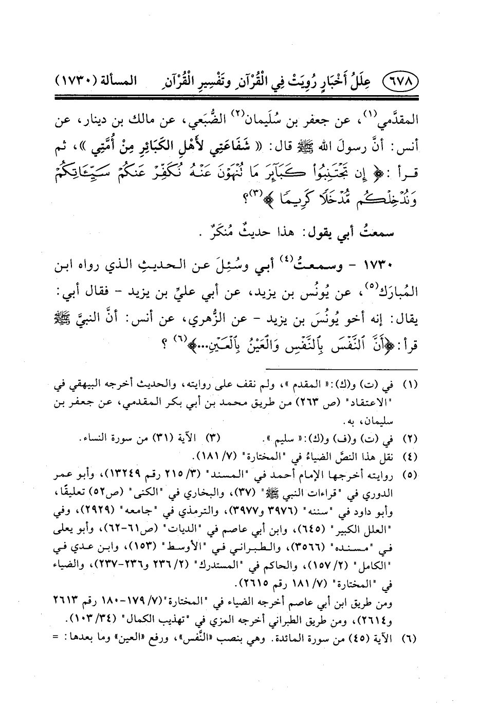 المقدَّمي (١) ، عَنْ جَعْفَرِ بْنِ سُلَيمان (٢) الضُّبَعي، عَنْ مَالِكِ بْنِ دِينَارٍ، عَنْ أَنَسٍ: أنَّ رسولَ اللَّهِ (ص) قَالَ: شَفَاعَتِي لأَهْلِ الكَبَائِرِ مِنْ أُمَّتِي، ثُمَّ قَرَأَ: {إِنْ تَجْتَنِبُوا كَبَائِرَ مَا تُنْهَوْنَ عَنْهُ نُكَفِّرْ عَنْكُمْ سَيِّئَاتِكُمْ وَنُدْخِلْكُمْ مُدْخَلاً كَرِيمًا *} (٣) ؟