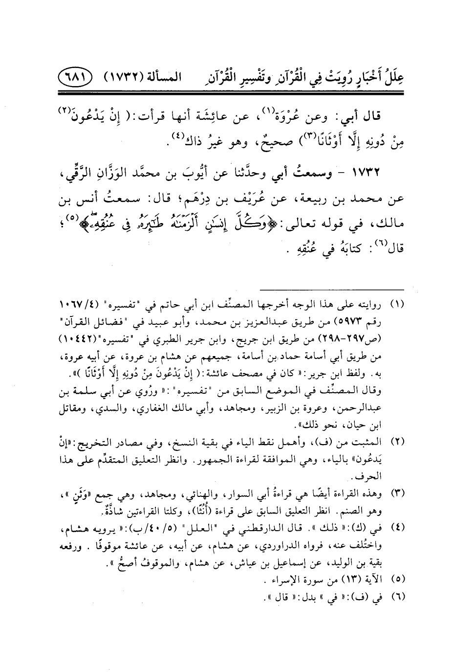 (١) روايته على هذا الوجه أخرجها المصنِّف ابن أبي حاتم في "تفسيره" (٤/١٠٦٧ رقم ٥٩٧٣) من طريق عبد العزيز بن محمد، وأبو عبيد في "فضائل القرآن" (ص٢٩٧-٢٩٨) من طريق ابن جريج، وابن جرير الطبري في "تفسيره" (١٠٤٤٢) من طريق أبي أسامة حماد بن أسامة، جميعهم عَنْ هِشَامِ بْنِ عُرْوَةَ، عَنْ أبيه عروة، به. ولفظ ابن جرير: «كان في مصحف عائشة: (إِنْ يَدْعُونَ مِنْ دُونِهِ إِلَاّ أَوْثَانًا) » .
