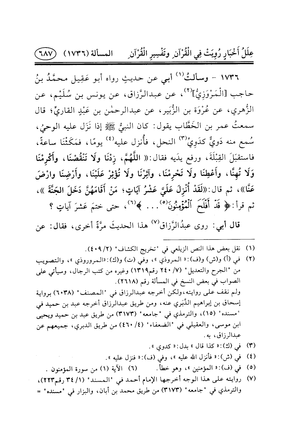١٧٣٦ - وسألتُ (١) أَبِي عَنْ حديثٍ رَوَاهُ أَبُو عَقِيل محمَّدُ بنُ حَاجِبٍ [الْمَرْوَزِيُّ] (٢) ، عن عبد الرَّزاق، عَنْ يُونُسَ بْنِ سُلَيْم، عَنِ الزُّهري، عَنْ عُرْوَة بْنِ الزُّبَير، عن عبد الرحمن بْنِ عَبْدٍ القاريِّ؛ قَالَ سمعتُ عُمَرَ بْنِ الخَطَّاب يَقُولُ: كَانَ النبيُّ (ص) إِذَا نَزَل عَلَيْهِ الوحيُ، سُمع مِنْهُ دَويٌّ كدَوِيِّ (٣) النَّحْلِ، فأُنزل عَلَيْهِ (٤) يَوْمًا، فمَكَثْنَا سَاعَةً، فاستقبَلَ القِبْلَةَ، وَرَفَعَ يدَيه فَقَالَ: اللَّهُمَّ، زِدْنَا ولَا تَنْقُصْنَا، وأَكْرِمْنَا وَلَا تُهِنَّا، وأَعْطِنَا ولَا تَحْرِمْنَا، وآثِرْنَا ولَا تُؤْثِرْ عَلَيْنَا، وأَرْضِنَا وارْضَ عَنَّا، ثُّمَ قَالَ: لَقَدْ أُنْزِلَ عَلَيَّ عَشْرُ آيَاتٍ؛ مَنْ أَقَامَهُنَّ دَخَلَ الجَنَّةَ، ثُمَّ قَرَأَ: {قَدْ أَفْلَحَ الْمُؤْمِنُونَ *} (٥) ... } (٦) ، حَتَّى ختمَ عَشرَ آياتٍ؟