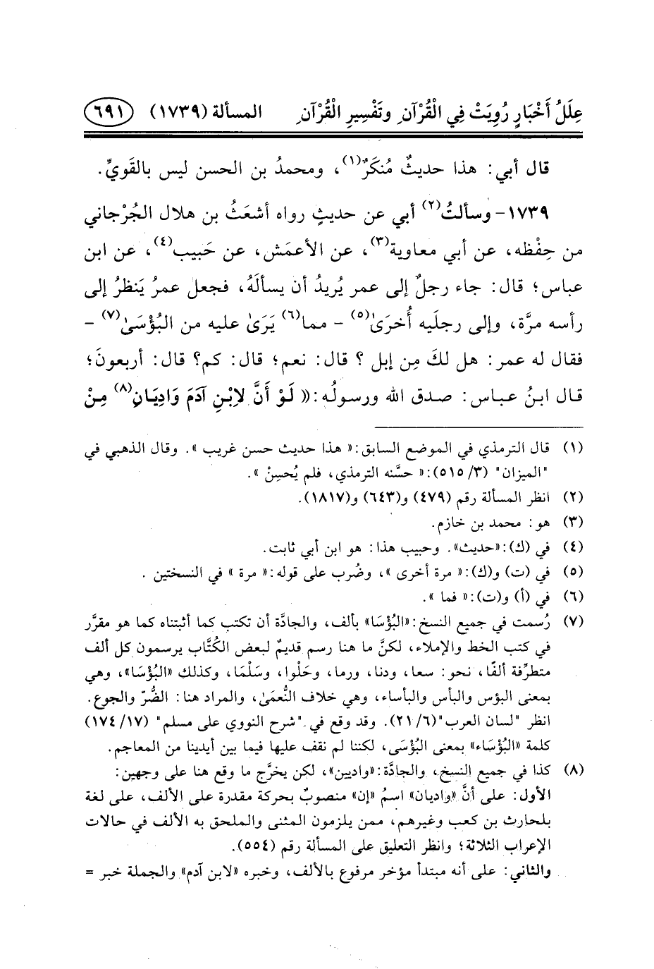 ١٧٣٩- وسألتُ (٢) أَبِي عَنْ حديثٍ رَوَاهُ أشعَثُ بْنُ هِلالٍ الجُرْجاني مِنْ حِفْظه، عَنْ أَبِي مُعَاوِيَةَ (٣) ، عَنِ الأعمَش، عَنْ حَبيب (٤) ، عَنِ ابْنِ عَبَّاسٍ؛ قَالَ: جَاءَ رجلٌ إِلَى عُمَرَ يُريدُ أَنْ يسألَهُ، فَجَعَلَ عمرُ يَنظرُ إِلَى رَأْسِهِ مرَّة، وَإِلَى رجلَيه أُخرَى (٥) - مما (٦) يَرَى عليه من البُؤْسَى (٧) - فَقَالَ لَهُ عُمَرُ: هَلْ لكَ مِن إِبِلٍ؟ قَالَ: نَعَمْ؛ قَالَ: كَمْ؟ قَالَ: أربعونَ؛ قَالَ ابنُ عَبَّاسٍ: صَدَقَ اللَّهُ ورسولُه: لَوْ أَنَّ لاِبْنِ آدَمَ وَادِيَانِ (٨)