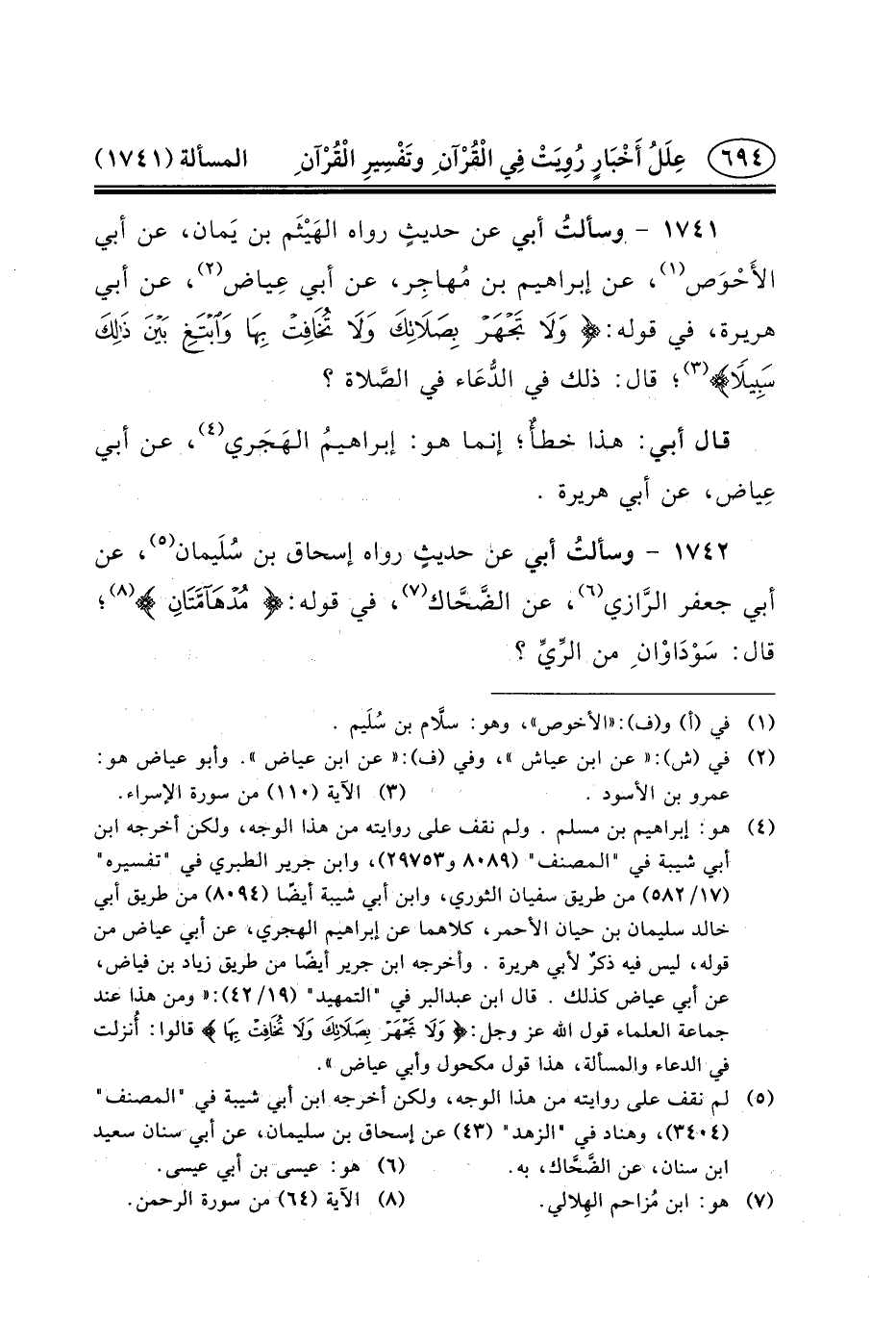 ١٧٤١ - وسألتُ أَبِي عَنْ حديثٍ رَوَاهُ الهَيْثَم بْنُ يَمان، عَنْ أَبِي الأَحْوَص (١) ، عَنْ إِبْرَاهِيمَ بْنِ مُهاجِر، عَنْ أَبِي عِياض (٢) ، عَنْ أَبِي هُرَيْرَةَ، فِي قَوْلِهِ: {وَلَا تَجْهَرْ بِصَلَاتِكَ وَلَا تُخَافِتْ بِهَا وَابْتَغِ بَيْنَ ذَلِكَ سَبِيلاً} (٣) ؛ قَالَ: ذَلِكَ فِي الدُّعَاء فِي الصَّلاة؟