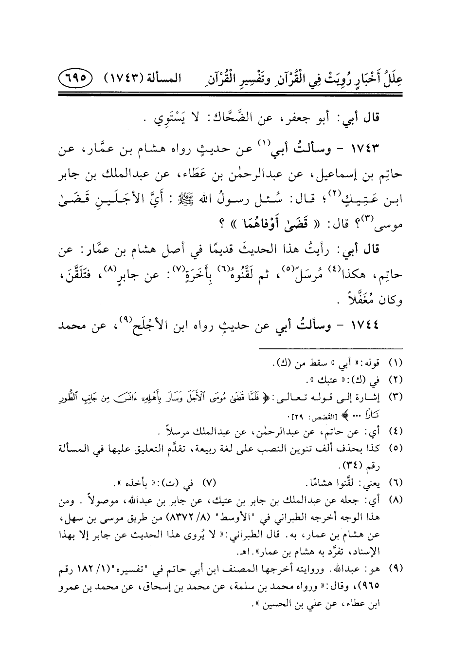 ١٧٤٣ - وسألتُ أَبِي (١) عَنْ حديثٍ رَوَاهُ هِشَامُ بْنُ عمَّار، عَنْ حاتِم بْنِ إِسْمَاعِيلَ، عن عبد الرحمن بن عَطَاء، عن عبد الملك بن جابر ابن عَتِيكٍ (٢) ؛ قَالَ: سُئل رسولُ اللَّهِ (ص) : أَيَّ الأجَلَينِ قَضَى مُوسَى (٣) ؟ قَالَ: قَضَى أَوْفاهُمَا؟