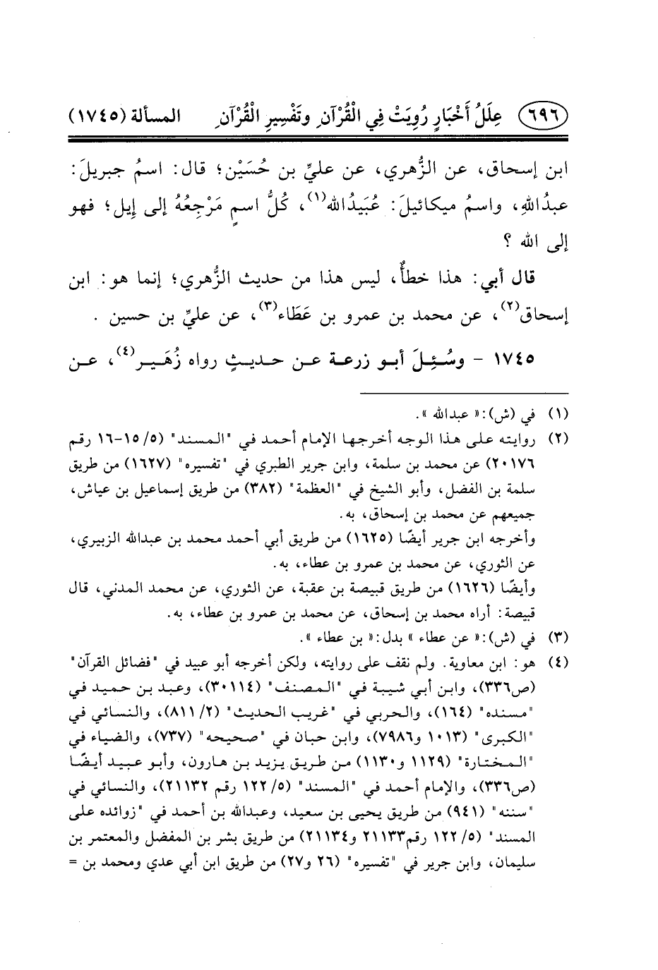 ابْنِ إِسْحَاقَ، عَنِ الزُّهري، عَنْ عليِّ بْنِ حُسَيْن؛ قَالَ: اسمُ جبريلَ: عبدُاللهِ، واسمُ ميكائيلَ: عُبَيدُالله (١) ، كُلُّ اسمٍ مَرْجِعُهُ إِلَى إِيل؛ فَهُوَ إِلَى اللَّهِ؟