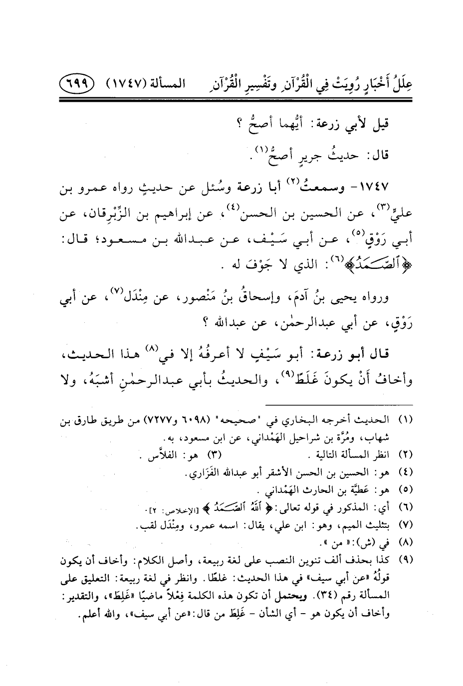 ١٧٤٧- وسمعتُ (٢) أَبَا زُرْعَةَ وسُئل عَنْ حديثٍ رَوَاهُ عَمْرُو بْنُ عليٍّ (٣) ، عَنْ الْحُسَيْنِ بْنِ الْحَسَنِ (٤) ، عَنْ إِبْرَاهِيمَ بْنِ الزِّبْرِقان، عَنْ أَبِي رَوْقٍ (٥) ، عن أبي سَيْف، عن عبد الله بْنِ مَسْعُودٍ؛ قَالَ: {الصَمَدُ} (٦) : الَّذِي لا جَوْفَ لَهُ.