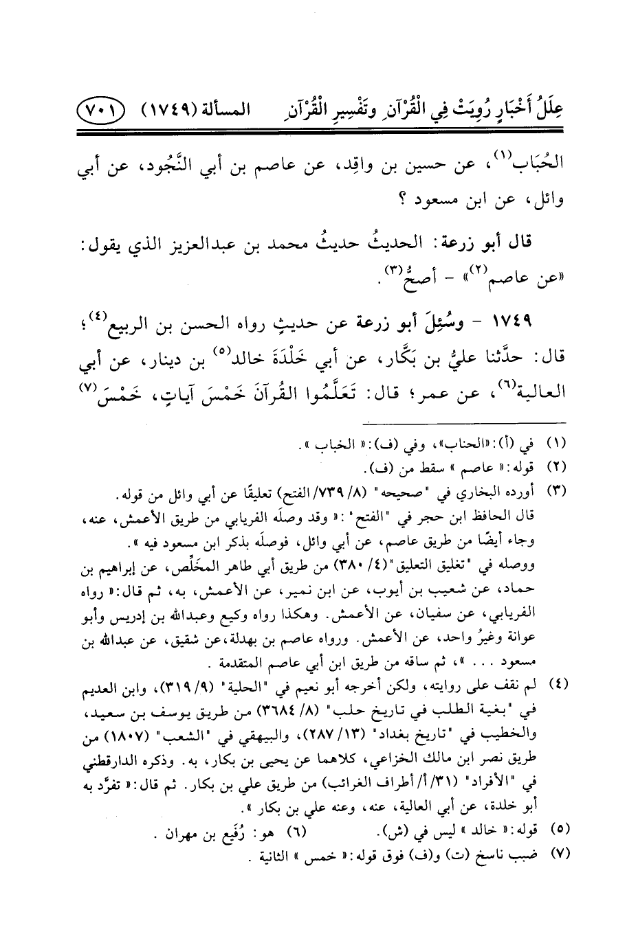 ١٧٤٩ - وسُئِلَ أَبُو زُرْعَةَ عَنْ حديثٍ رَوَاهُ الْحَسَنُ بْنُ الرَّبِيعِ (٤) ؛ قَالَ: حدَّثنا عليُّ بْنُ بَكَّار، عَنْ أَبِي خَلْدَةَ خَالِدِ (٥) بْنِ دِينَارٍ، عَنْ أَبِي الْعَالِيَةِ (٦) ، عَنْ عُمَرَ؛ قَالَ: تَعَلَّمُوا القُرآنَ خَمْسَ آياتٍ، خَمْسَ (٧)