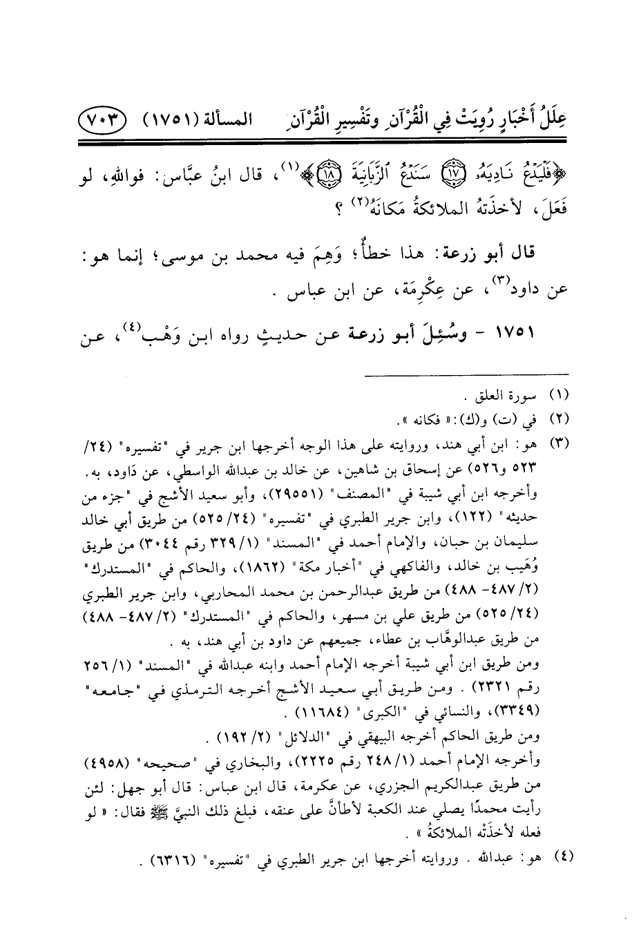 ١٧٥١ - وسُئِلَ أَبُو زُرْعَةَ عَنْ حديثٍ رواه ابن وَهْب (٤) ، عن