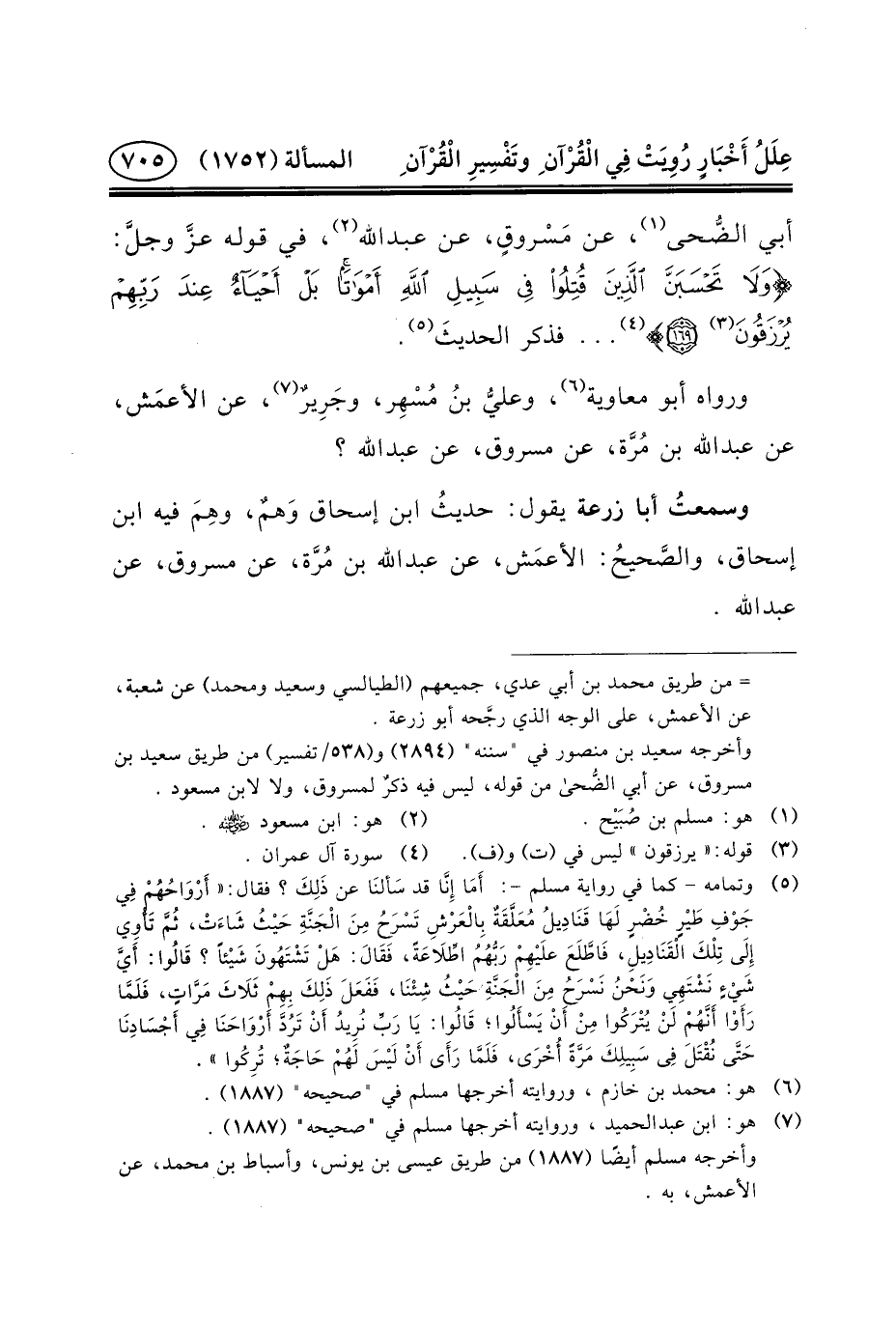 أَبِي الضُّحى (١) ، عَن مَسْروقٍ، عَن عبد الله (٢) ، فِي قَوْلِهِ عزَّ وجلَّ: {وَلَا تَحْسَبَنَّ الَّذِينَ قُتِلُوا فِي سَبِيلِ اللَّهِ أَمْوَاتًا بَلْ أَحْيَاءٌ عِنْدَ رَبِّهِمْ يُرْزَقُونَ (٣) *} (٤) ... فَذَكَرَ الحديثَ (٥) .