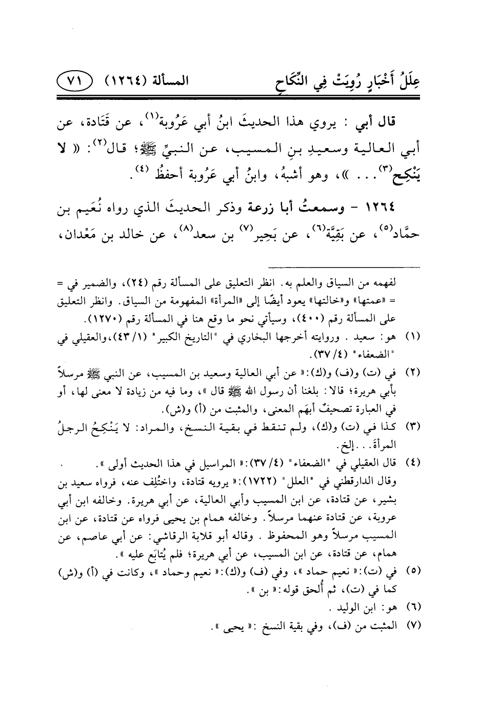 قَالَ أَبِي: يَرْوِي هَذَا الحديثَ ابنُ أَبِي عَرُوبة (١) ، عَنْ قَتَادة، عَنْ أَبِي الْعَالِيَةِ وسعيدِ بنِ المسيب، عن النبيِّ (ص) ؛ قَالَ (٢) : لا يَنْكِح (٣) ... ، وَهُوَ أشبهُ، وابنُ أَبِي عَرُوبة أحفظُ (٤) .