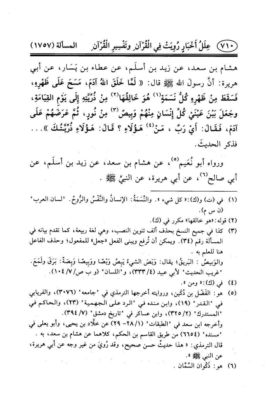 هِشَامِ بْنِ سَعْدٍ، عَنْ زَيْدِ بْنِ أسلَم، عَنْ عَطَاءِ بْنِ يَسَار، عَنْ أَبِي هُرَيْرَةَ: أنَّ رسولَ الله (ص) قَالَ: لَمَّا خَلَقَ اللهُ آدَمَ، مَسَحَ عَلَى ظَهْرِهِ، فَسَقَطَ مِنْ ظَهْرِهِ كُلُّ نَسَمَةٍ (١) هُوَ خَالِقُهَا (٢) مِنْ ذُرِّيَّتِهِ إِلَى يَوْمِ القِيَامَةِ، وجَعَلَ بَيْنَ عَيْنَيْ كُلِّ إِنْسَانٍ مِنْهُمْ وَبِيصً (٣)