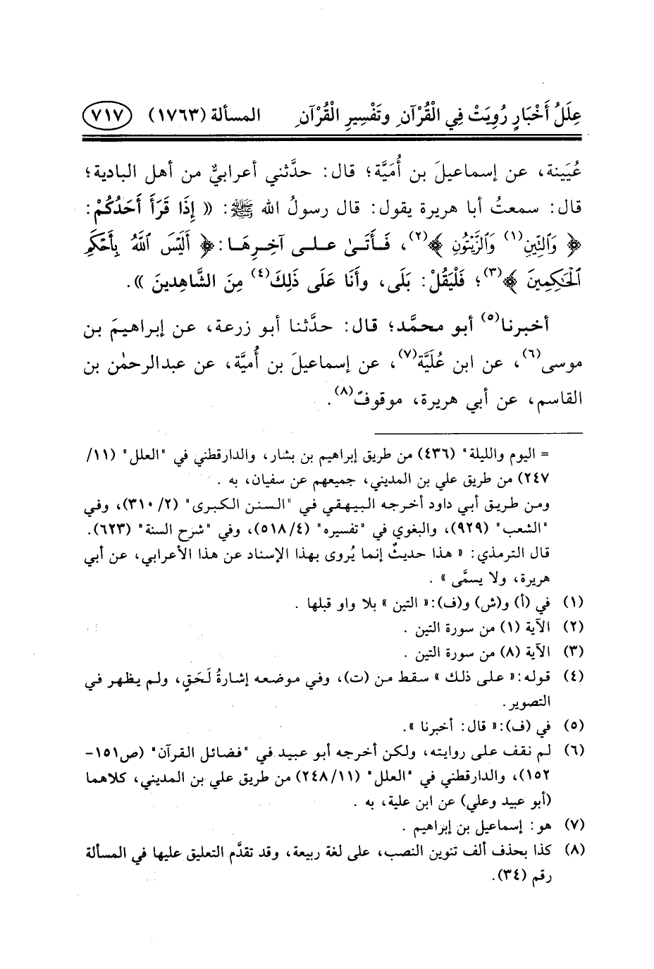 عُيَينة، عَنْ إسماعيلَ بْنِ أُمَيَّة؛ قَالَ: حدَّثني أعرابيٌّ مِنْ أَهْلِ الْبَادِيَةِ؛ قَالَ: سمعتُ أَبَا هُرَيْرَةَ يقول: قال رسولُ الله (ص) : إِذَا قَرَأَ أَحَدُكُمْ: {وَالتِّينِ (١) وَالزَّيْتُونِ *} (٢) ، فَأَتَى عَلَى آخِرِهَا: {أَلَيْسَ اللَّهُ بِأَحْكَمِ الْحَاكِمِينَ *} (٣) ؛ فَلْيَقُلْ: بَلَى، وأَنَا عَلَى ذَلِكَ (٤) مِنَ الشَّاهِدينَ.