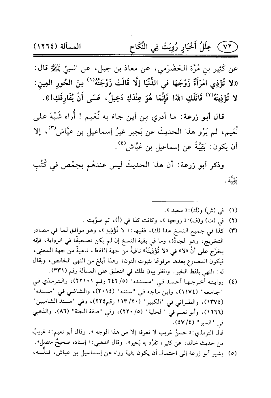 قَالَ أَبُو زُرْعَةَ: مَا أَدْرِي مِن أَيْنَ جاءَ بِهِ نُعَيم! أُراه شُبِّهَ عَلَى نُعَيم، لَمْ يَرْو هَذَا الحديثَ عَنْ بَحِير غيرُ إِسْمَاعِيلَ بْنِ عيَّاش (٣) ،