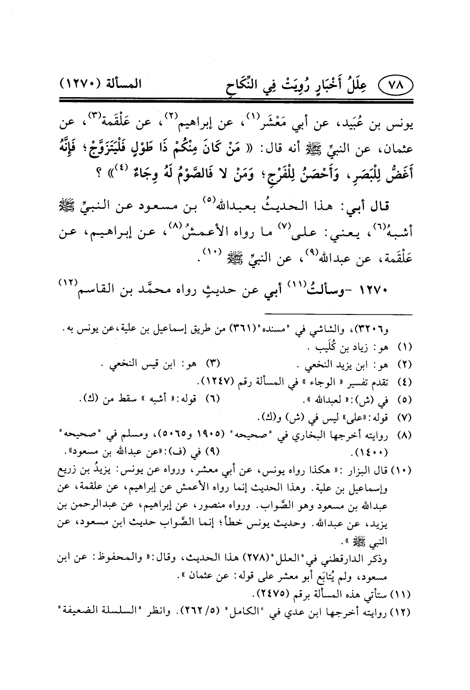 يُونُسَ بْنِ عُبَيد، عَنْ أَبِي مَعْشَر (١) ، عَنْ إِبْرَاهِيمَ (٢) ، عَنْ عَلْقَمة (٣) ، عن عثمان، عن النبيِّ (ص) أَنَّهُ قَالَ: مَنْ كَانَ مِنْكُمْ ذَا طَوْلٍ فَلْيَتَزَوَّجْ؛ فَإِنَّهُ أَغَضُّ لِلْبَصَرِ، وَأَحْصَنُ لِلْفَرْجِ؛ وَمَنْ لا فَالصَّوْمُ لَهُ وِجَاءٌ (٤) ؟
