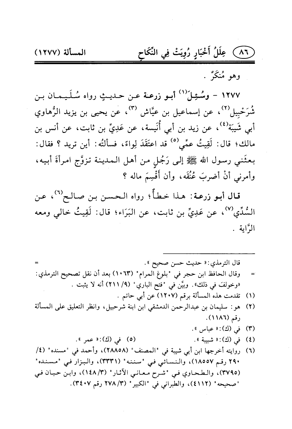 ١٢٧٧ - وسُئِلَ (١) أَبُو زُرْعَةَ عَنْ حديثٍ رَوَاهُ سُلَيمان بْنُ شُرَحْبِيل (٢) ، عَنْ إِسْمَاعِيلَ بْنِ عيَّاش (٣) ، عَنْ يَحْيَى بْنِ يَزِيدَ الرُّهاوي أَبِي شَيبَة (٤) ، عَنْ زَيْدِ بْنِ أَبِي أُنَيسة، عَن عَدِيِّ بْن ثَابِتٍ، عَنْ أَنَسِ بْنِ مَالِكٍ؛ قَالَ: لَقِيتُ عمِّي (٥) قَدِ اعتَقَدَ لِواءً، فسألتُه: أَيْنَ تُرِيدُ؟ فَقَالَ: بعثَني رسول الله (ص) إِلَى رَجُلٍ مِنْ أَهْلِ الْمَدِينَةِ تزوَّج امرأةَ أَبِيهِ، وَأَمَرَنِي أنْ أضربَ عُنُقَه، وَأَنْ أَقْسِمَ مَالَهُ؟