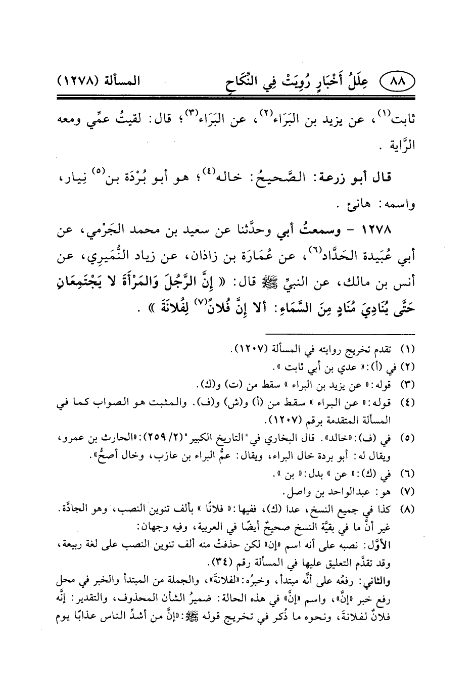 (٣) قوله: «عن البراء» سقط من (أ) و (ش) و (ف) . والمثبت هو الصواب كما في المسألة المتقدمة برقم (١٢٠٧) .