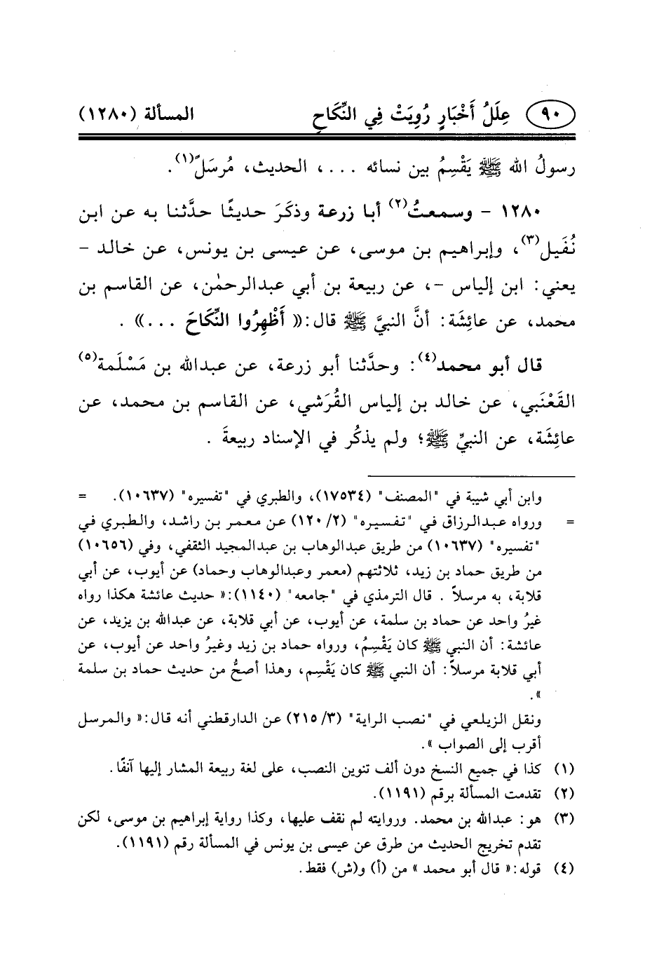 ١٢٨٠ - وسمعتُ (٢) أَبَا زُرْعَةَ وذكَرَ حَدِيثًا حدَّثنا بِهِ عَنِ ابْنِ نُفَيل (٣) ، وَإِبْرَاهِيمَ بْنِ مُوسَى، عَنْ عِيسَى بْنِ يُونُسَ، عَنْ خَالِدٍ - يَعْنِي: ابْنَ إِلْيَاسٍ -، عَنْ رَبِيعَةَ بْنِ أبي عبد الرحمن، عَنِ الْقَاسِمِ بْنِ مُحَمَّدٍ، عَنْ عائِشَة: أنَّ النبيَّ (ص) قَالَ: أَظْهِرُوا النِّكَاحَ ... .