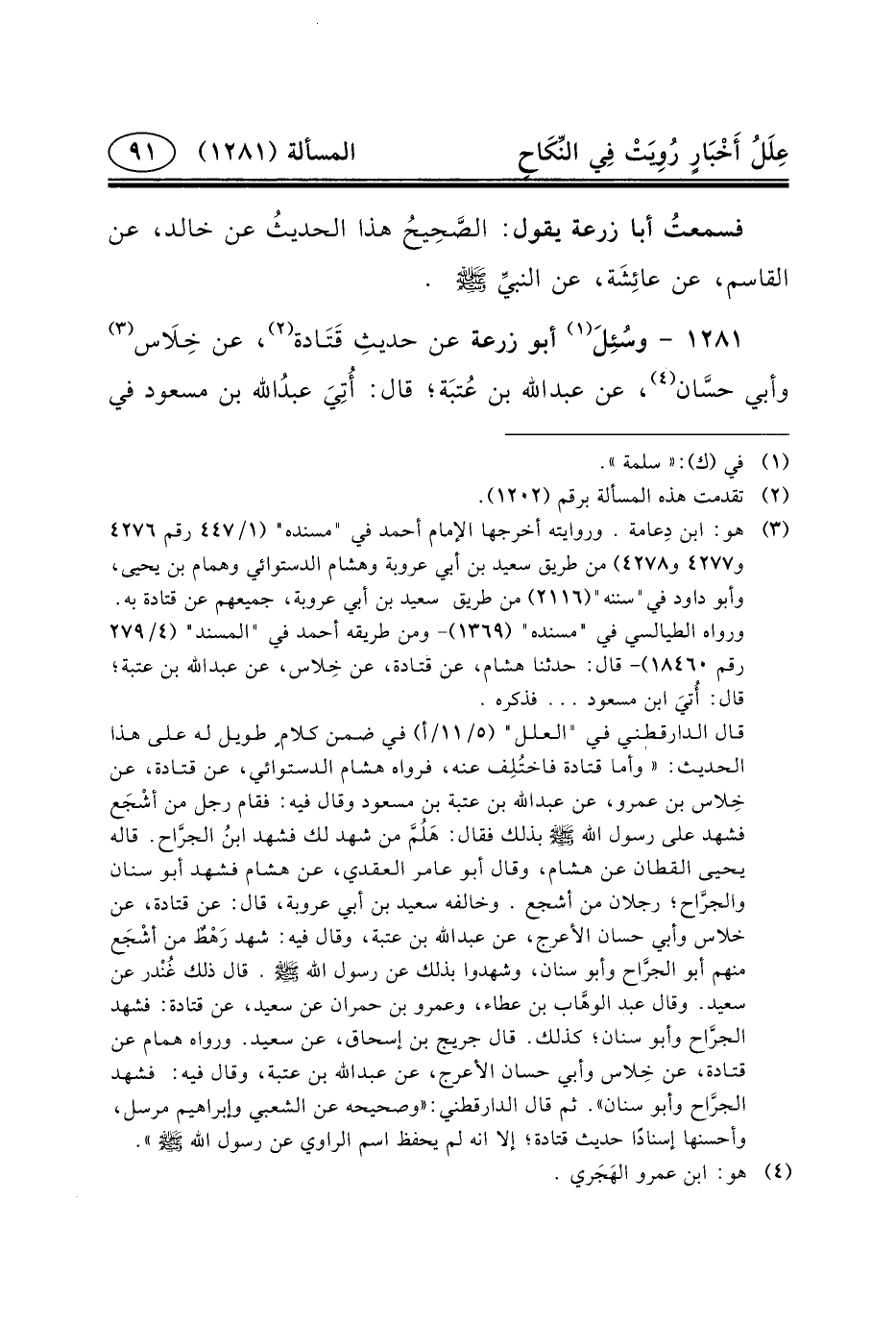 ١٢٨١ - وسُئِلَ (١) أَبُو زُرْعَةَ عَنْ حديثِ قَتَادة (٢) ،