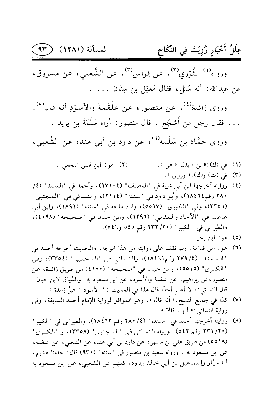 (٦) روايته أخرجها أحمد في "مسنده" (٤/٢٨٠ رقم ١٨٤٦٢) ، والطبراني في "الكبير" (٢٠/٢٣١ رقم ٥٤٢) . ورواه النسائي في "المجتبى" (٣٣٥٨) ، و "الكبرى" (٥٥١٨) من طريق علي بن مسهر، عن داود ابن أَبِي هِنْدٍ، عَنِ الشَّعْبِيِّ، عَنْ علقمة، عن ابن مسعود به. ورواه سعيد بن منصور في "سننه" (٩٣٠) قال: حدثنا هشيم، أنا سيَّار وَإِسْمَاعِيلُ بْنُ أَبِي خَالِدٍ وداود، كلهم عن الشعبي، عن ابن مسعود به وقالوا: قام معقل ابن سنان الأشجعي. وحديث سيَّار وَإِسْمَاعِيلُ بْنُ أَبِي خَالِدٍ أخرجه النسائي في "الكبرى" (٥٥٢٢ و٥٥٢٣) . ورواه عبد الرزاق في "المصنف" (١٠٨٩٩) ، والنسائي في "الكبرى" (٥٥٢١) من طريق عاصم، عن الشعبي، عن ابن مسعود.