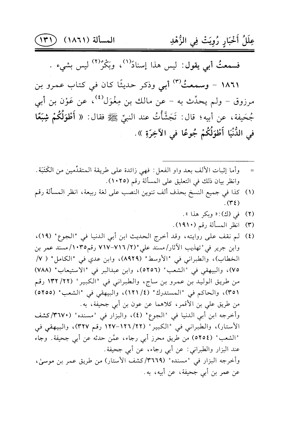 ١٨٦١ - وسمعتُ (٣) أَبِي وَذَكَرَ حَدِيثًا كَانَ فِي كِتَابِ عَمْرِو بْنِ مَرْزُوقٍ - وَلَمْ يحدِّث بِهِ - عَنْ مَالِكِ بْنِ مِغْوَل (٤) ، عَن عَوْن بْن أَبِي جُحَيفة، عَنْ أَبِيهِ؛ قَالَ: تَجَشَّأْتُ عِنْدَ النبيِّ (ص) فَقَالَ: أَطْوَلُكُمْ شِبَعًا فِي الدُّنْيَا أَطْوَلُكُمْ جُوعًا في الآخِرَةِ.