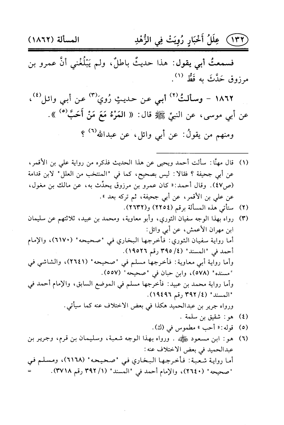 ١٨٦٢- وسألتُ (٢) أَبِي عَنْ حديثٍ رُويَ (٣) عَنْ أَبِي وَائِلٍ (٤) ، عَنْ أَبِي موسى، عن النبيِّ (ص) قَالَ: المَرْءُ مَعَ مَنْ أَحَبَّ (٥) .