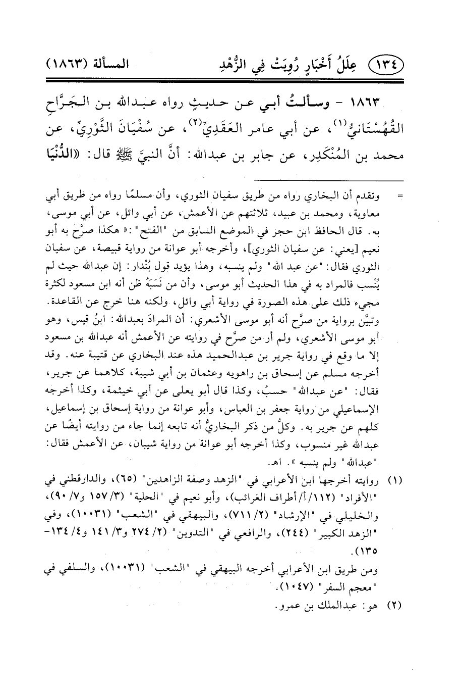 ١٨٦٣ - وسألتُ أَبِي عَنْ حديثٍ رَوَاهُ عبد الله بْنُ الجَرَّاحِ القُهُسْتَانيُّ (١) ، عَنْ أَبِي عَامِرٍ العَقَدِيِّ (٢) ، عَنْ سُفْيَانَ الثَّوْرِيِّ، عَنْ مُحَمَّدِ بْنِ المُنْكَدِر، عَن جابر بن عبد الله: أنَّ النبيَّ (ص) قال: الدُّنْيَا