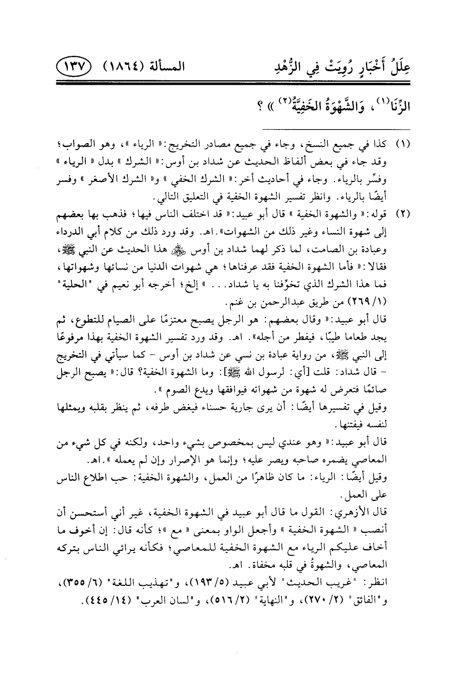 (٢) قوله: «والشهوة الخفية» قال أبو عبيد: «قد اختلف الناس فيها؛ فذهب بها بعضهم إلى شهوة النساء وغير ذلك من الشهوات» . اهـ. وقد ورد ذلك من كلام أبي الدرداء وعبادة بن الصامت، لما ذكر لهما شداد بن أوس ج هذا الحديث عن النبي (ص) ، فقالا: «فأما الشهوة الخفية فقد عرفناها؛ هي شهوات الدنيا من نسائها وشهواتها، فما هذا الشرك الذي تخوِّفنا به يا شداد ... » إلخ؛ أخرجه أبو نعيم في "الحلية" (١/٢٦٩) من طريق عبد الرحمن بن غنم.