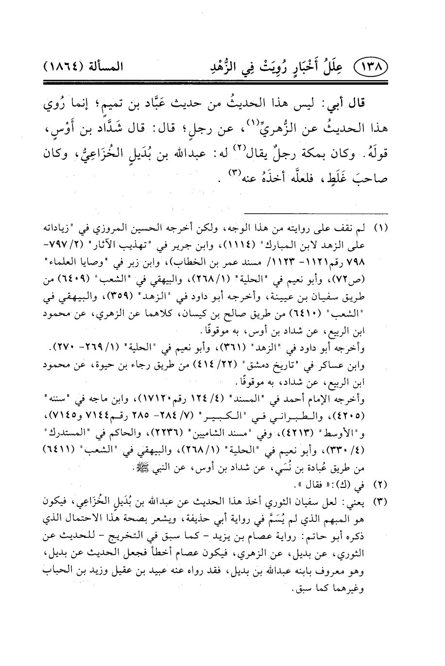 قَالَ أَبِي: لَيْسَ هَذَا الحديثُ مِنْ حَدِيثِ عَبَّاد بْنِ تميمٍ؛ إِنَّمَا رُوي هَذَا الحديثُ عَنِ الزُّهريِّ (١) ، عَنْ رجلٍ؛ قَالَ: قَالَ شَدَّاد بْنُ أَوْسٍ، قولَهُ. وَكَانَ بمكة رجلٌ يقال (٢) له: عبد الله بْنُ بُدَيلٍ الخُزَاعِيُّ، وَكَانَ صاحبَ غَلَطٍ، فلعلَّه أخذَهُ عنه (٣) .