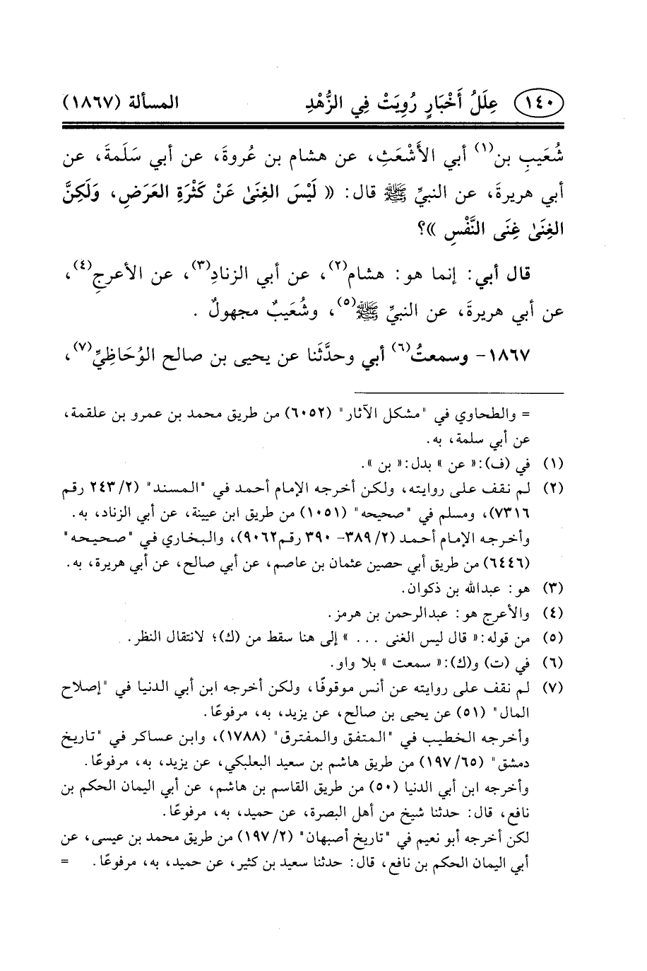 شُعَيبِ بْنُ (١) أَبِي الأَشْعَثِ، عَنْ هِشَامِ بْنِ عُروةَ، عَنْ أَبِي سَلَمةَ، عَنْ أَبِي هريرةَ، عَنِ النبيِّ (ص) قَالَ: لَيْسَ الغِنَى عَنْ كَثْرَةِ العَرَضِ، وَلَكِنَّ الغِنَى غِنَى النَّفْسِ؟