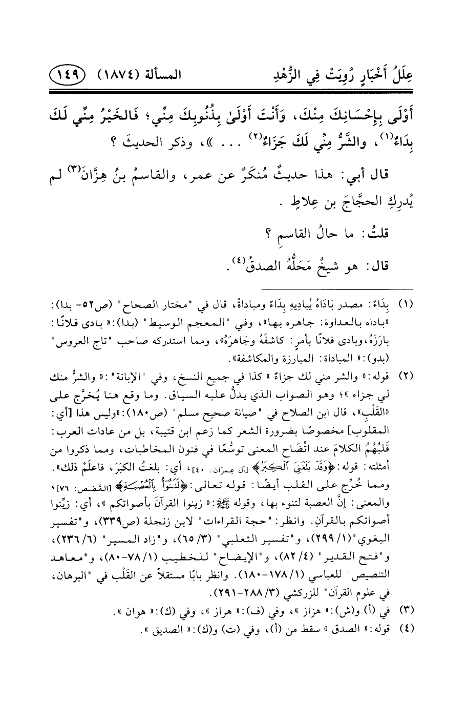 (٢) قوله: «والشر مني لك جزاءٌ» كذا في جميع النسخ، وفي "الإبانة": «والشرُّ منك لي جزاء» ؛ وهو الصواب الذي يدلُّ عليه السياق. وما وقع هنا يُخرَّج على «القَلْبِ» ، قال ابن الصلاح في "صيانة صحيح مسلم" (ص١٨٠) : «وليس هذا [أي: المقلوب] مخصوصًا بضرورة الشعر كما زعم ابن قتيبة، بل من عادات العرب: قَلبُهُمُ الكلامَ عند اتِّضَاح المعنى توسُّعًا في فنون المخاطبات، ومما ذكروا من أمثلته: قوله: [آل عِمرَان: ٤٠] {وَقَدْ بَلَغَنِيَ الْكِبَرُ} ، أي: بلغتُ الكبَرَ، فاعلَمْ ذلك» ..ومما خُرِّج على القلب أيضًا: قوله تعالى: [القَصَص: ٧٦] {لَتَنُوءُ بِالْعُصْبَةِ} ، والمعنى: إنَّ العصبة لتنوء بها، وقوله (ص) : «زينوا القرآنَ بأصواتكم» ، أي: زيِّنوا أصواتكم بالقرآنِ. وانظر: "حجة القراءات" لابن زنجلة (ص٣٣٩) ، و"تفسير البغوي" (١/٢٩٩) ، و"تفسير الثعلبي" (٣/٦٥) ، و"زاد المسير" (٦/٢٣٦) ، و"فتح القدير" (٤/٨٢) ، و"الإيضاح" للخطيب (١/٧٨-٨٠) ، و"معاهد التنصيص" للعباسي (١/١٧٨-١٨٠) . وانظر بابًا مستقلاً عن القَلْب في "البرهان، في علوم القرآن" للزركشي (٣/٢٨٨-٢٩١) .