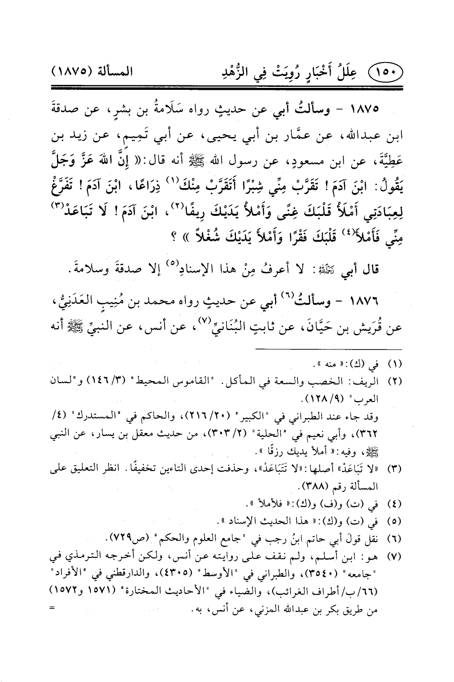 ١٨٧٥ - وسألتُ أَبِي عَنْ حديثٍ رَوَاهُ سَلَامةُ بْنُ بشرٍ، عَنْ صدقةَ بن عبد الله، عَنْ عمَّار بْنِ أَبِي يَحْيَى، عَنْ أَبِي تَمِيمٍ، عَنْ زَيْدِ ابن عَطِيَّةَ، عَنِ ابْنِ مسعودٍ، عَنْ رسول الله (ص) أَنَّهُ قَالَ: إِنَّ اللهَ عَزَّ وَجَلَّ يَقُولُ: ابْنَ آدَمَ! تَقَرَّبْ مِنِّي شِبْرًا أَتَقَرَّبْ مِنْكَ (١) ذِرَاعًا، ابْنَ آدَمَ! تَفَرَّغْ لِعِبَادَتِي أَمْلَأْ قَلْبَكَ غِنًى وَأَمْلأْ يَدَيْكَ رِيفًا (٢) ، ابْنَ آدَمَ! لَا تَبَاعَدْ (٣) مِنِّي فَأَمْلأَ (٤) قَلْبَكَ فَقْرًا وَأَمْلأَ يَدَيْكَ شُغْلاً؟