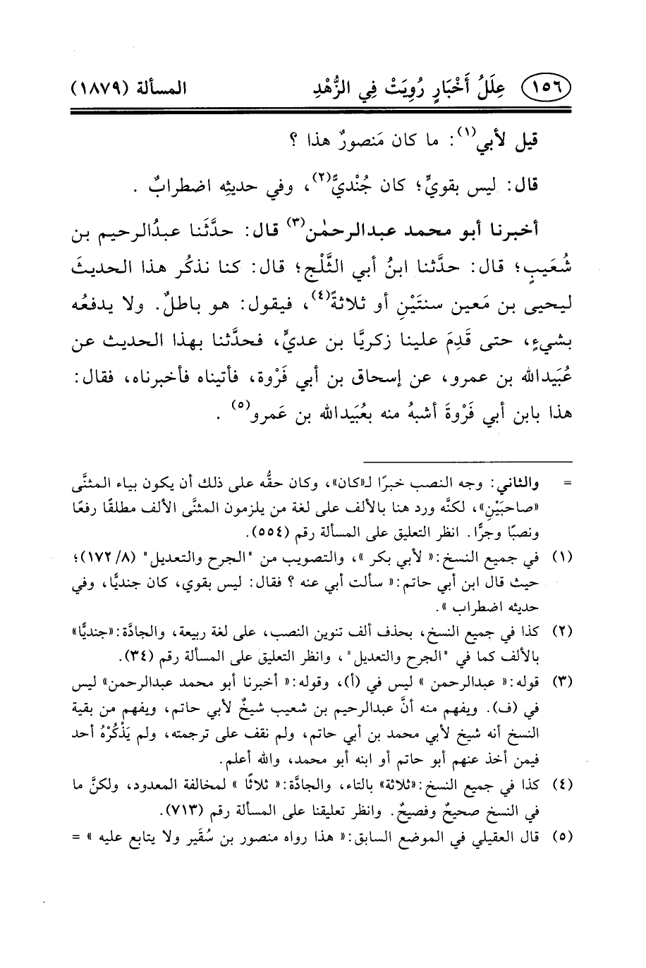 (٣) قوله: «عبد الرحمن» ليس في (أ) ، وقوله: «أخبرنا أبو محمد عبد الرحمن» ليس في (ف) . ويفهم منه أنَّ عبد الرحيم بن شعيب شيخٌ لأبي حاتم، ويفهم من بقية النسخ أنه شيخ لأبي محمد بن أبي حاتم، ولم نقف على ترجمته، ولم يَذْكُرْهُ أحد فيمن أخذ عنهم أبو حاتم أو ابنه أبو محمد، والله أعلم.