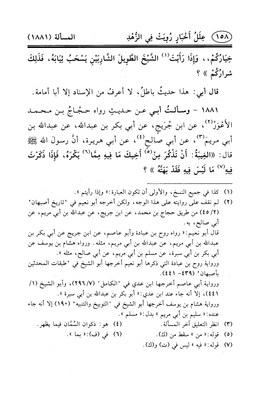 عَنِ ابْنِ جُرَيجٍ، عَنْ أَبِي بَكْرِ بْنِ عبد الله، عن عبد الله بْنِ أَبِي مريمَ (٣) ، عَنْ أَبِي صالحٍ (٤) ، عَنْ أَبِي هُرَيْرَةَ، أنَّ رسولَ الله (ص) قَالَ: الغِيبَةُ: أَنْ تَذْكُرَ مِنْ (٥) أَخِيكَ مَا فِيهِ مِمَّا (٦) يَكْرَهُ، فَإِذَا ذَكَرْتَ فِيهِ (٧) مَا لَيْسَ فِيهِ فَقَدْ بَهَتَّهُ؟