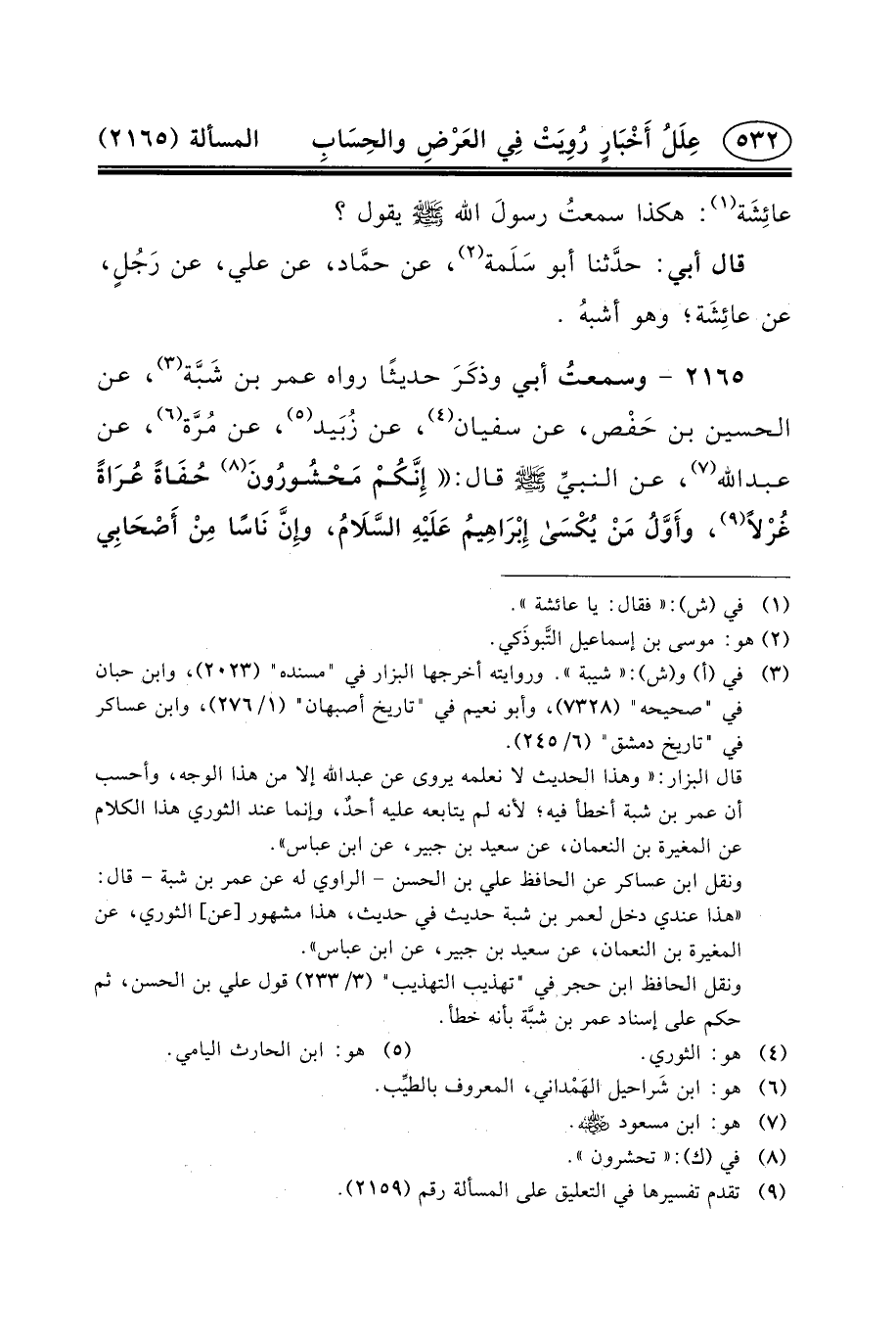 ٢١٦٥ - وسمعتُ أَبِي وذكَرَ حَدِيثًا رَوَاهُ عُمَرُ بْنُ شَبَّة (٣) ، عَنِ الْحُسَيْنِ بْنِ حَفْص، عَنْ سُفْيَانَ (٤) ، عَنْ زُبَيد (٥) ، عَنْ مُرَّة (٦) ، عَنْ عبد الله (٧) ، عن النبيِّ (ص) قَالَ: إِنَّكُمْ مَحْشُورُونَ (٨) حُفَاةً عُرَاةً غُرْلاً (٩) ، وأَوَّلُ مَنْ يُكْسَى إِبْرَاهِيمُ عَلَيْهِ السَّلَامُ، وإِنَّ نَاسًا مِنْ أَصْحَابِي