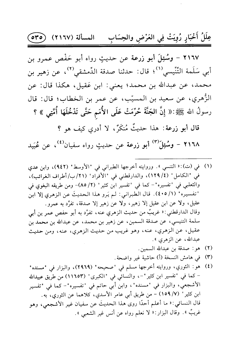 ٢١٦٧ - وسُئِلَ أَبُو زُرْعَةَ عَنْ حديثٍ رَوَاهُ أَبُو حَفْص عَمْرُو بْنُ أَبِي سَلَمة التِّنِّيسي (١) ؛ قَالَ: حَدَّثَنَا صَدَقَةُ الدِّمشقي (٢) ، عَنْ زُهَيْرِ بْنِ محمد، عن عبد الله بْنِ مُحَمَّدٍ؛ يَعْنِي: ابْنَ عَقيل، هَكَذَا قَالَ: عَنِ الزُّهري، عَنْ سَعِيدِ بْنِ الْمُسَيِّبِ، عَنْ عُمَرَ بْنِ الْخَطَّابِ؛ قَالَ: قَالَ رسولُ الله (ص) : إِنَّ الجَنَّةَ حُرِّمَتْ عَلَى الأُمَمِ حَتَّى تَدْخُلَهَا أُمَّتِي؟