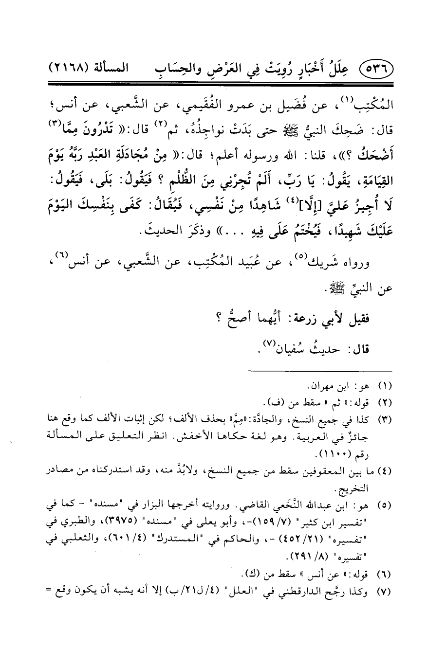 (٧) وكذا رجَّح الدارقطني في "العلل" (٤/ل٢١/ب) إلا أنه يشبه أن يكون وقع سقطٌ في النسخة الخطية، فقد جاءت العبارة فيها هكذا: «يرويه عُبَيْد بن المُكْتِب، واختُلف عنه فرواه شَرِيكٌ، عَنْ عُبَيد المُكْتِب، عَنِ فُضَيل بن عمرو القَعنَبي (كذا) ، عن الشَّعبي، عن أنس، وهو الصَّحيح» . اهـ.