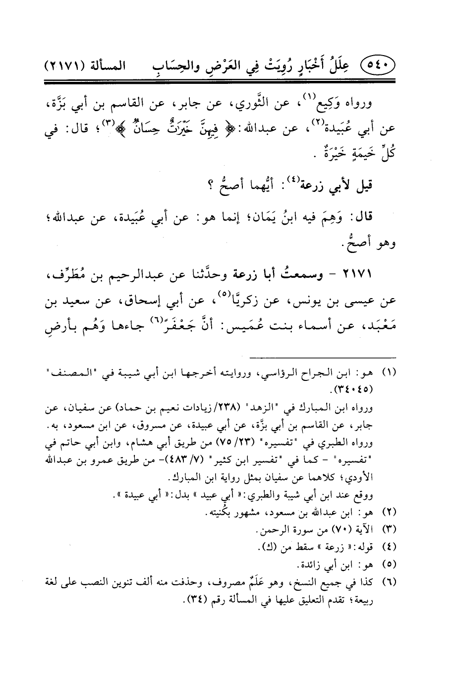 ٢١٧١ - وسمعتُ أَبَا زُرْعَةَ وحدَّثنا عن عبد الرحيم بْنُ مُطَرِّف، عَنْ عِيسَى بْنِ يُونُسَ، عَنْ زكريَّا (٥) ، عَنْ أَبِي إِسْحَاقَ، عَنْ سَعِيدِ بْنِ مَعْبَد، عَنْ أَسْمَاءَ بِنْتِ عُمَيس: أنَّ جَعْفَرً (٦) جاءها وَهُم بأرضِ