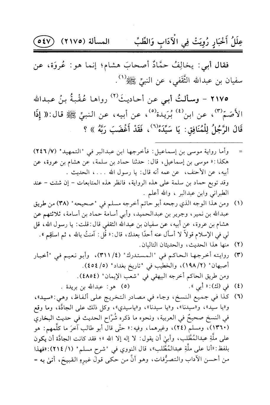 عَنِ ابْنِ (٤) بُرَيدة (٥) ، عَنْ أبيه، عن النبيِّ (ص) قَالَ: إِذَا قَالَ الرَّجُلُ لِلْمُنَافِقِ: يَا سَيِّدَهُ (٦) ، فَقَدْ أَغْضَبَ رَبَّهُ؟