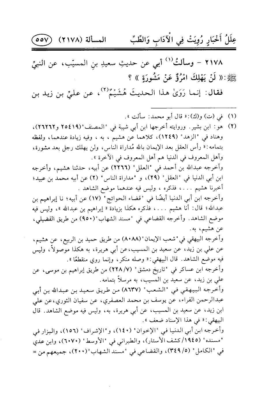 ٢١٧٨ - وسألتُ (١) أَبِي عَنْ حديثِ سعيدِ ابنِ المسيّب، عن النبيِّ (ص) : لَنْ يَهْلِكَ امْرُؤٌ عَنْ مَشُورَةٍ؟