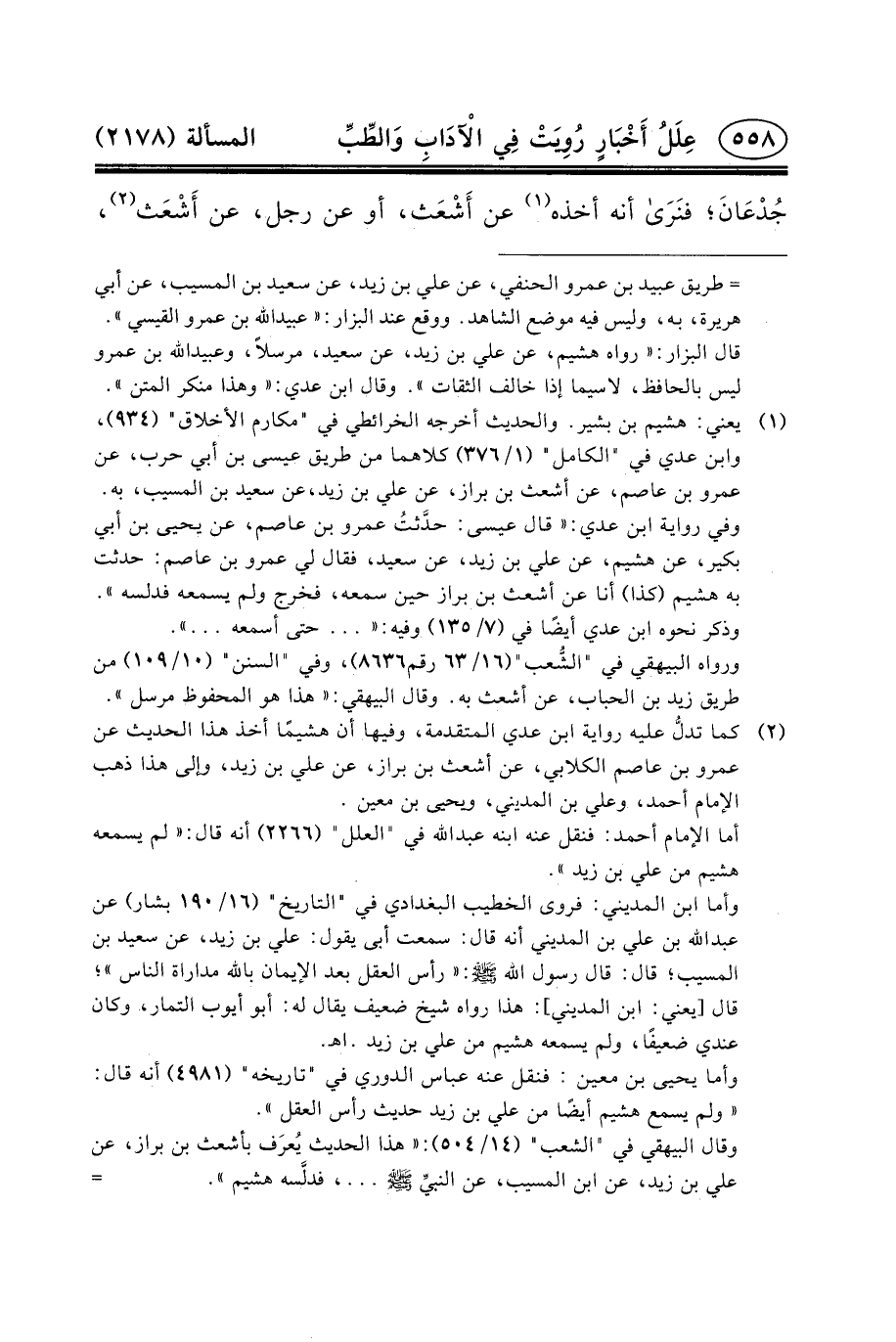 (٢) كما تدلُّ عليه رواية ابن عدي المتقدمة، وفيها أن هشيمًا أخذ هَذَا الْحَدِيثَ عَنْ عَمْرِو بْنِ عاصم الكلابي، عن أشعث بن براز، عن علي بن زيد، وإلى هذا ذهب الإمام أحمد، وعلي بن المديني، ويحيى بن معين.
