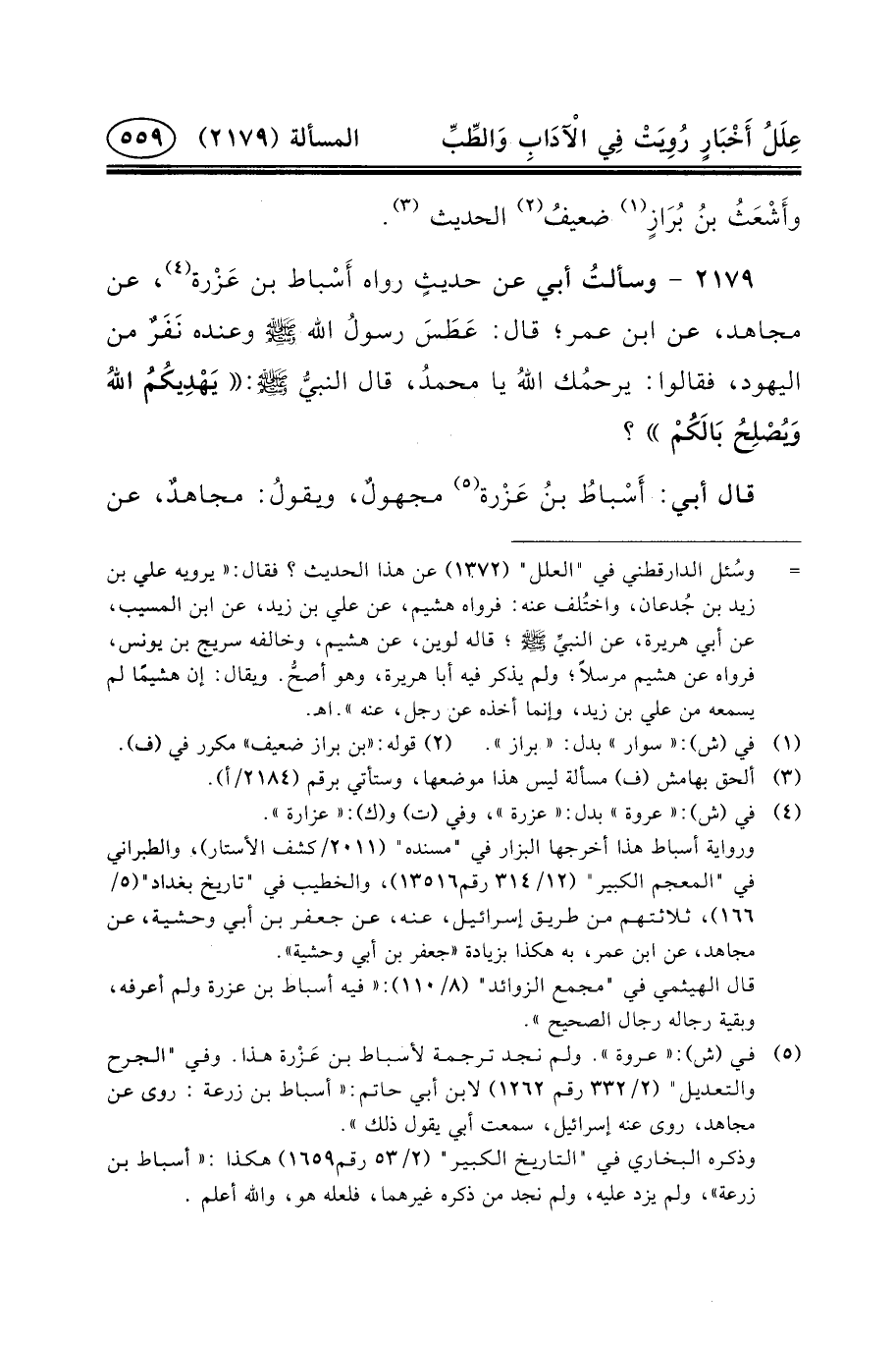 ٢١٧٩ - وسألتُ أَبِي عَنْ حديثٍ رَوَاهُ أَسْباط بن عَزْرة (٤) ، عَنْ مُجَاهِدٍ، عَنِ ابْنِ عُمَرَ؛ قال: عَطَسَ رسولُ الله (ص) وَعِنْدَهُ نَفَرٌ مِنَ الْيَهُودِ، فَقَالُوا: يرحمُك اللهُ يَا محمدُ، قَالَ النبيُّ (ص) : يَهْدِيكُمُ اللهُ وَيُصْلِحُ بَالَكُمْ؟
