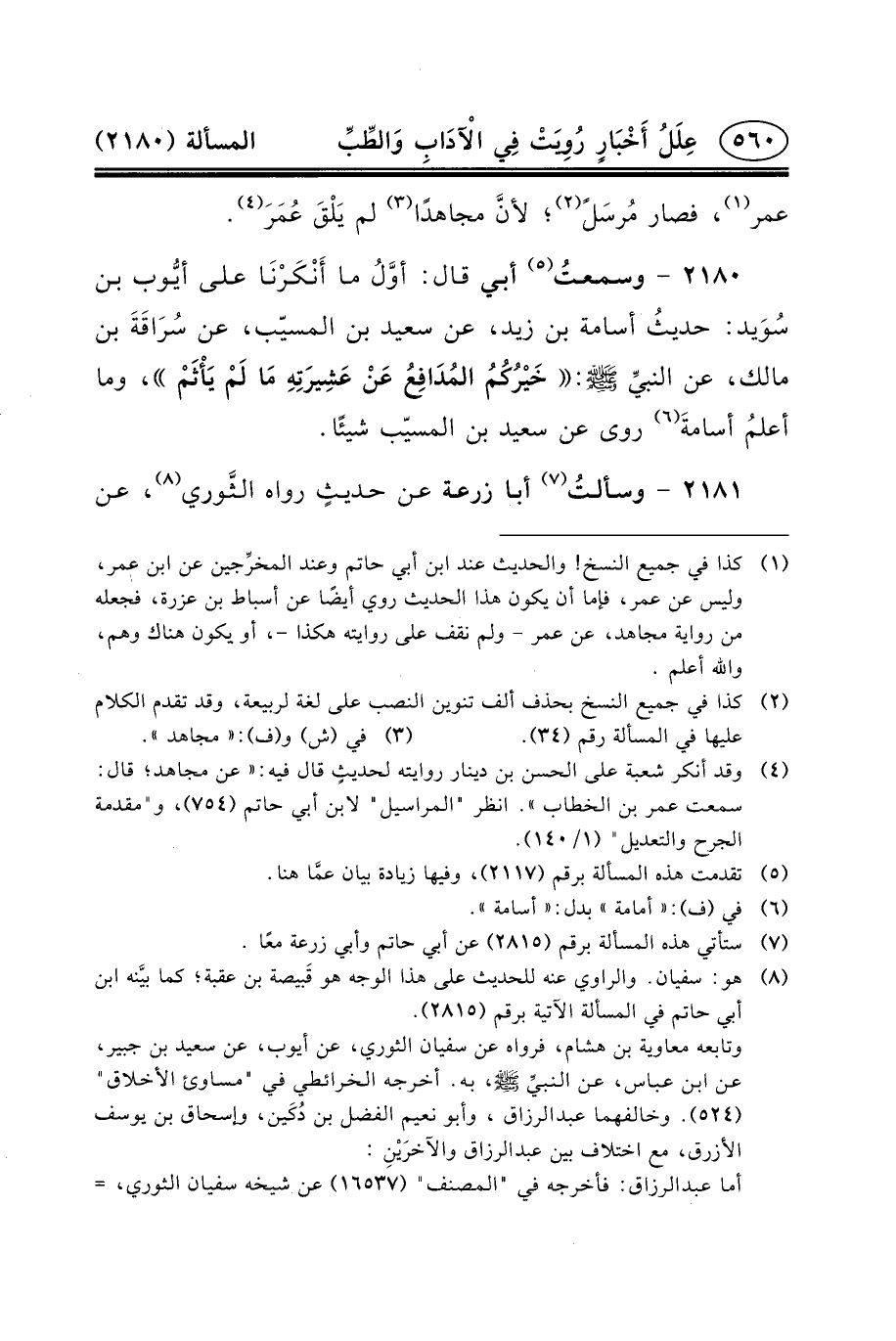 ٢١٨٠ - وسمعتُ (٥) أبي قال: أوَّلُ مَا أَنْكَرْنَا عَلَى أيُّوب بْنِ سُوَيد: حديثُ أُسَامَةَ بْنِ زَيْدٍ، عَنْ سَعِيدِ بْنِ الْمُسَيِّبِ، عَنْ سُرَاقَةَ بْنِ مَالِكٍ، عَنِ النبيِّ (ص) : خَيْرُكُمُ المُدَافِعُ عَنْ عَشِيرَتِهِ مَا لَمْ يَأْثَمْ، وَمَا أعلمُ أسامةَ (٦) رَوَى عَنْ سَعِيدِ بْنِ الْمُسَيِّبِ شيئا.