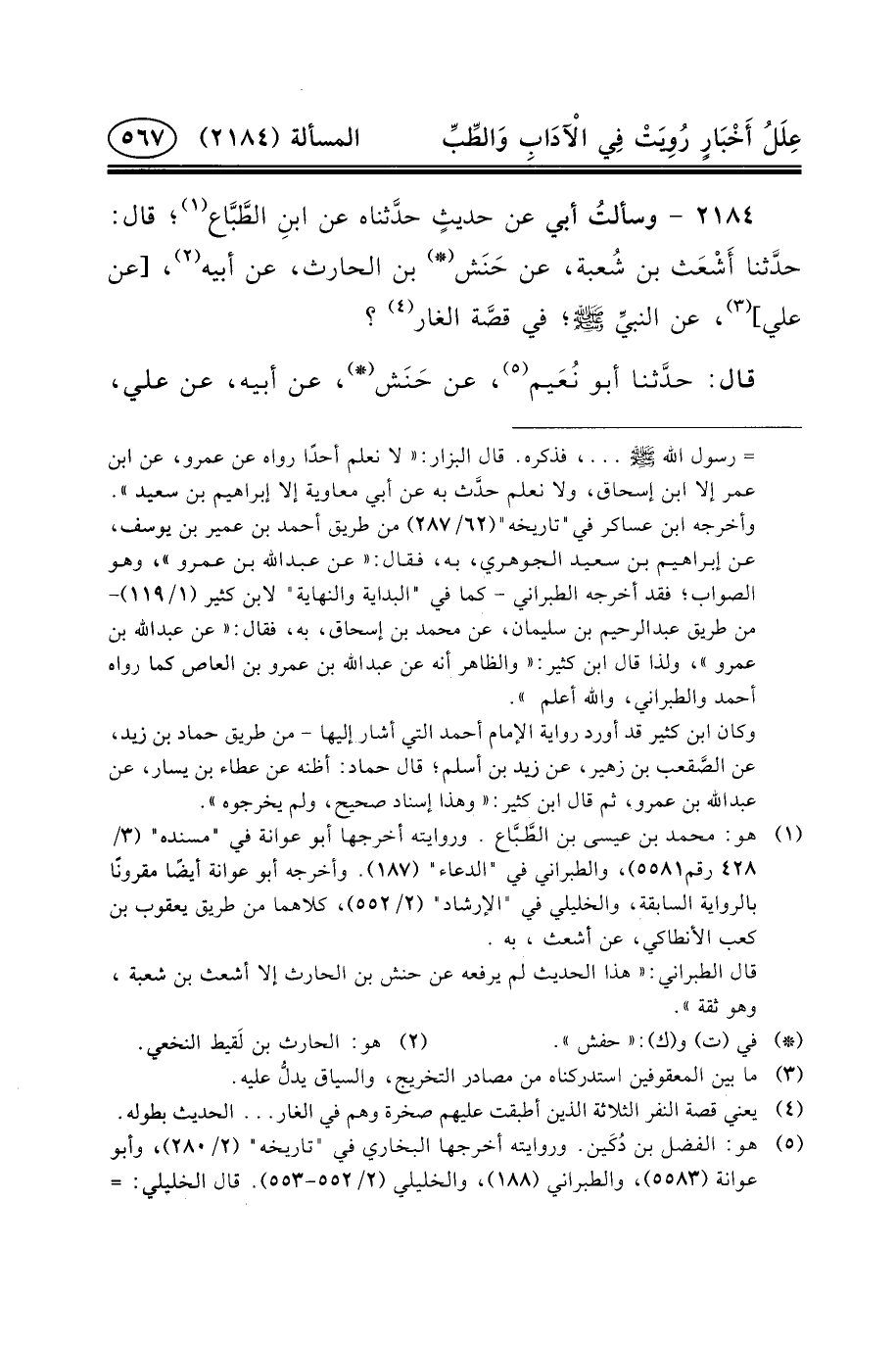 ٢١٨٤ - وسألتُ أَبِي عَنْ حديثٍ حدَّثناه عَنِ ابنِ الطَّبَّاع (١) ؛ قَالَ: حدَّثنا أَشْعَث بْنُ شُعبة، عَنْ حَنَش (*) بْنِ الْحَارِثِ، عَنْ أَبِيهِ (٢) ، [عَنِ علي] (٣) ، عن النبيِّ (ص) ؛ فِي قصَّة الْغَارِ (٤) ؟
