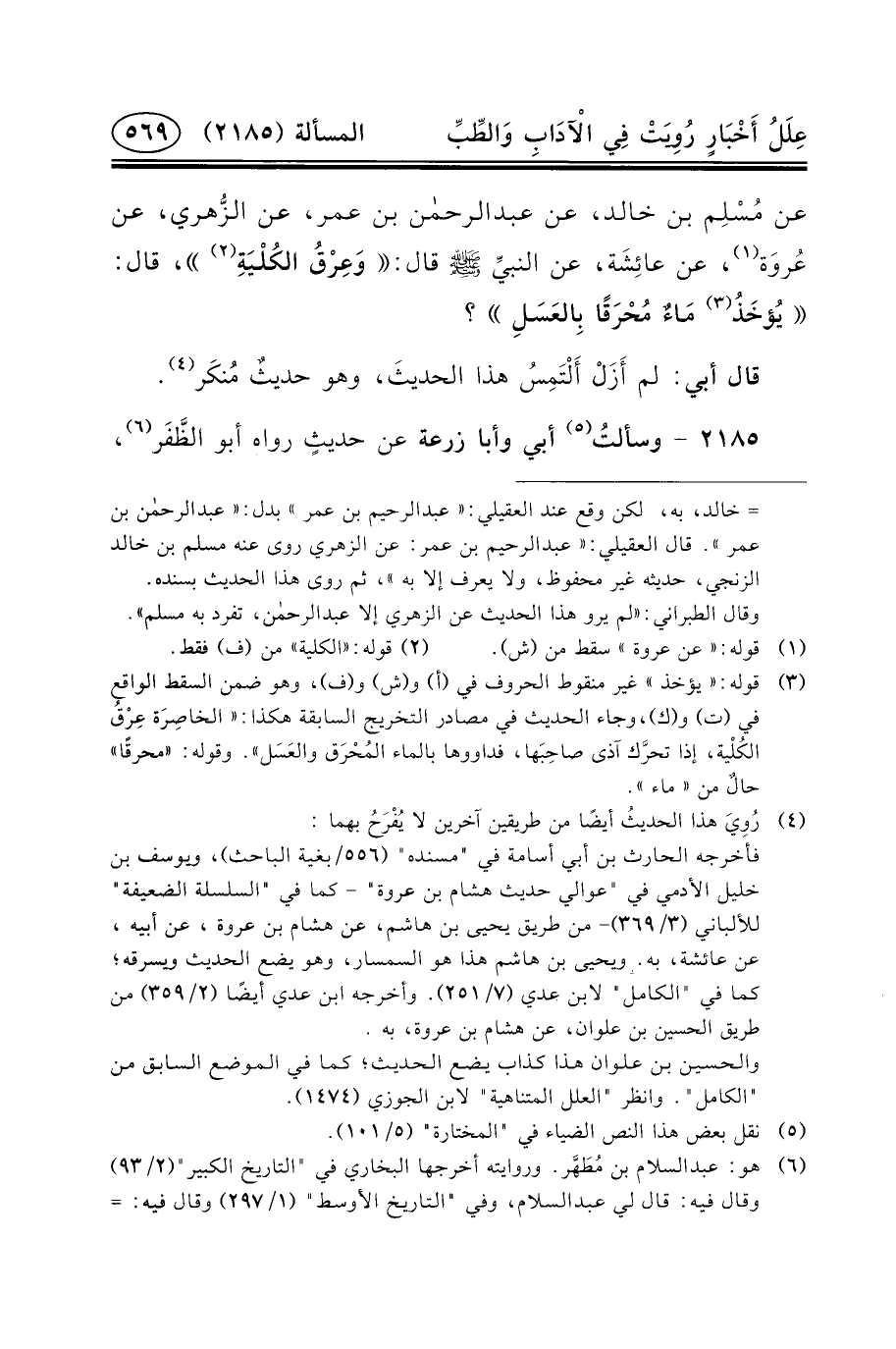 عَنْ مُسْلِم بْنِ خَالِدٍ، عَنْ عبد الرحمن بْنُ عُمَرَ، عَنِ الزُّهري، عَنْ عُروَة (١) ، عَنْ عائِشَة، عَنِ النبيِّ (ص) قال: وَعِرْقُ الكُلْيَةِ (٢) ، قَالَ: يُؤخَذُ (٣) مَاءٌ مُحْرَقًا بِالعَسَلِ؟