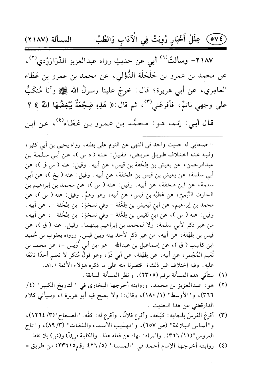 ٢١٨٧- وسألتُ (١) أَبِي عَنْ حديثٍ رَوَاهُ عبد العزيز الدَّرَاوَرْدي (٢) ، عَنْ مُحَمَّدِ بْنِ عَمْرِو ابن حَلْحَلَة الدُّؤَلي، عَنْ مُحَمَّدِ بْنِ عَمْرِو بْنِ عَطَاء العامِري، عَنْ أَبِي هُرَيْرَةَ؛ قَالَ: خرجَ عَلَيْنَا رسولُ الله (ص) وَأَنَا مُنكَبٌّ عَلَى وَجْهِي نائمٌ، فأقرعَني (٣) ، ثُمَّ قَالَ: هَذِهِ ضِجْعَةٌ يُبْغِضُهَا اللهُ؟