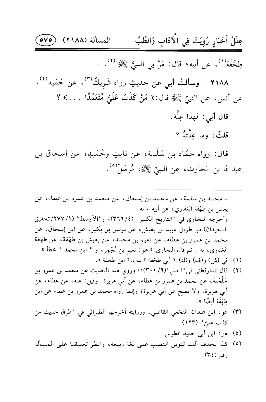 ٢١٨٨ - وسألتُ أَبِي عَنْ حديثٍ رَوَاهُ شَرِيكٌ (٣) ، عَنْ حُمَيد (٤) ، عَنْ أَنَسٍ، عن النبيِّ (ص) قَالَ: مَنْ كَذَبَ عَلَيَّ مُتَعَمِّدًا ... ؟